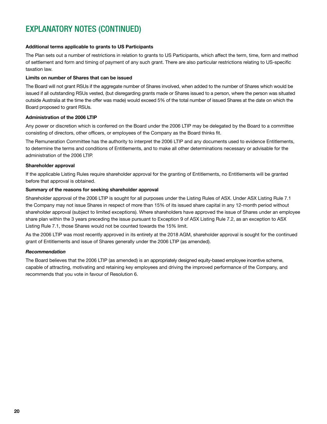 20 Additional terms applicable to grants to US Participants The Plan sets out a number of restrictions in relation to grants to US Participants, which affect the term, time, form and method of settlement and form and timing of payment of any such grant. There are also particular restrictions relating to US-specific taxation law. Limits on number of Shares that can be issued The Board will not grant RSUs if the aggregate number of Shares involved, when added to the number of Shares which would be issued if all outstanding RSUs vested, (but disregarding grants made or Shares issued to a person, where the person was situated outside Australia at the time the offer was made) would exceed 5% of the total number of issued Shares at the date on which the Board proposed to grant RSUs. Administration of the 2006 LTIP Any power or discretion which is conferred on the Board under the 2006 LTIP may be delegated by the Board to a committee consisting of directors, other officers, or employees of the Company as the Board thinks fit. The Remuneration Committee has the authority to interpret the 2006 LTIP and any documents used to evidence Entitlements, to determine the terms and conditions of Entitlements, and to make all other determinations necessary or advisable for the administration of the 2006 LTIP. Shareholder approval If the applicable Listing Rules require shareholder approval for the granting of Entitlements, no Entitlements will be granted before that approval is obtained. Summary of the reasons for seeking shareholder approval Shareholder approval of the 2006 LTIP is sought for all purposes under the Listing Rules of ASX. Under ASX Listing Rule 7.1 the Company may not issue Shares in respect of more than 15% of its issued share capital in any 12-month period without shareholder approval (subject to limited exceptions). Where shareholders have approved the issue of Shares under an employee share plan within the 3 years preceding the issue pursuant to Exception 9 of ASX Listing Rule 7.2, as an exception to ASX Listing Rule 7.1, those Shares would not be counted towards the 15% limit. As the 2006 LTIP was most recently approved in its entirety at the 2018 AGM, shareholder approval is sought for the continued grant of Entitlements and issue of Shares generally under the 2006 LTIP (as amended). Recommendation The Board believes that the 2006 LTIP (as amended) is an appropriately designed equity-based employee incentive scheme, capable of attracting, motivating and retaining key employees and driving the improved performance of the Company, and recommends that you vote in favour of Resolution 6. EXPLANATORY NOTES (CONTINUED)