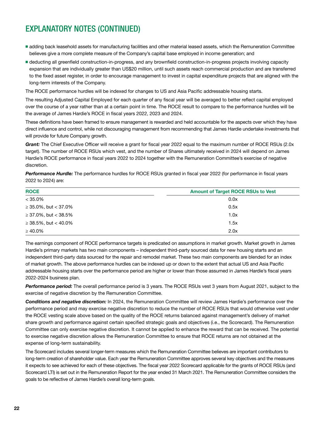 22 ■ adding back leasehold assets for manufacturing facilities and other material leased assets, which the Remuneration Committee believes give a more complete measure of the Company’s capital base employed in income generation; and ■ deducting all greenfield construction-in-progress, and any brownfield construction-in-progress projects involving capacity expansion that are individually greater than US$20 million, until such assets reach commercial production and are transferred to the fixed asset register, in order to encourage management to invest in capital expenditure projects that are aligned with the long-term interests of the Company. The ROCE performance hurdles will be indexed for changes to US and Asia Pacific addressable housing starts. The resulting Adjusted Capital Employed for each quarter of any fiscal year will be averaged to better reflect capital employed over the course of a year rather than at a certain point in time. The ROCE result to compare to the performance hurdles will be the average of James Hardie’s ROCE in fiscal years 2022, 2023 and 2024. These definitions have been framed to ensure management is rewarded and held accountable for the aspects over which they have direct influence and control, while not discouraging management from recommending that James Hardie undertake investments that will provide for future Company growth. Grant: The Chief Executive Officer will receive a grant for fiscal year 2022 equal to the maximum number of ROCE RSUs (2.0x target). The number of ROCE RSUs which vest, and the number of Shares ultimately received in 2024 will depend on James Hardie’s ROCE performance in fiscal years 2022 to 2024 together with the Remuneration Committee’s exercise of negative discretion. Performance Hurdle: The performance hurdles for ROCE RSUs granted in fiscal year 2022 (for performance in fiscal years 2022 to 2024) are: ROCE Amount of Target ROCE RSUs to Vest < 35.0% 0.0x ≥ 35.0%, but < 37.0% 0.5x ≥ 37.0%, but < 38.5% 1.0x ≥ 38.5%, but < 40.0% 1.5x ≥ 40.0% 2.0x The earnings component of ROCE performance targets is predicated on assumptions in market growth. Market growth in James Hardie’s primary markets has two main components – independent third-party sourced data for new housing starts and an independent third-party data sourced for the repair and remodel market. These two main components are blended for an index of market growth. The above performance hurdles can be indexed up or down to the extent that actual US and Asia Pacific addressable housing starts over the performance period are higher or lower than those assumed in James Hardie’s fiscal years 2022-2024 business plan. Performance period: The overall performance period is 3 years. The ROCE RSUs vest 3 years from August 2021, subject to the exercise of negative discretion by the Remuneration Committee. Conditions and negative discretion: In 2024, the Remuneration Committee will review James Hardie’s performance over the performance period and may exercise negative discretion to reduce the number of ROCE RSUs that would otherwise vest under the ROCE vesting scale above based on the quality of the ROCE returns balanced against management’s delivery of market share growth and performance against certain specified strategic goals and objectives (i.e., the Scorecard). The Remuneration Committee can only exercise negative discretion. It cannot be applied to enhance the reward that can be received. The potential to exercise negative discretion allows the Remuneration Committee to ensure that ROCE returns are not obtained at the expense of long-term sustainability. The Scorecard includes several longer-term measures which the Remuneration Committee believes are important contributors to long-term creation of shareholder value. Each year the Remuneration Committee approves several key objectives and the measures it expects to see achieved for each of these objectives. The fiscal year 2022 Scorecard applicable for the grants of ROCE RSUs (and Scorecard LTI) is set out in the Remuneration Report for the year ended 31 March 2021. The Remuneration Committee considers the goals to be reflective of James Hardie’s overall long-term goals. EXPLANATORY NOTES (CONTINUED)