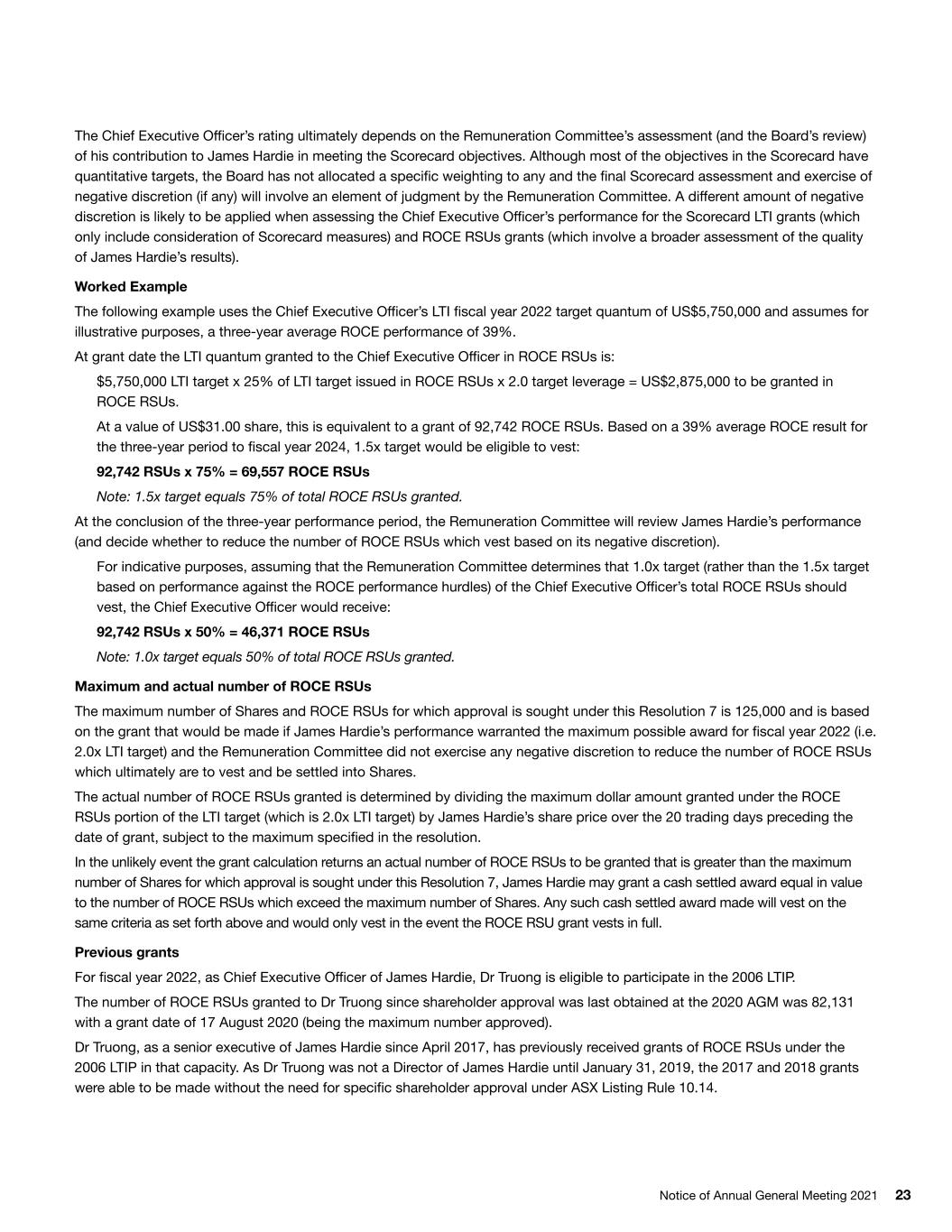 Notice of Annual General Meeting 2021 23 The Chief Executive Officer’s rating ultimately depends on the Remuneration Committee’s assessment (and the Board’s review) of his contribution to James Hardie in meeting the Scorecard objectives. Although most of the objectives in the Scorecard have quantitative targets, the Board has not allocated a specific weighting to any and the final Scorecard assessment and exercise of negative discretion (if any) will involve an element of judgment by the Remuneration Committee. A different amount of negative discretion is likely to be applied when assessing the Chief Executive Officer’s performance for the Scorecard LTI grants (which only include consideration of Scorecard measures) and ROCE RSUs grants (which involve a broader assessment of the quality of James Hardie’s results). Worked Example The following example uses the Chief Executive Officer’s LTI fiscal year 2022 target quantum of US$5,750,000 and assumes for illustrative purposes, a three-year average ROCE performance of 39%. At grant date the LTI quantum granted to the Chief Executive Officer in ROCE RSUs is: $5,750,000 LTI target x 25% of LTI target issued in ROCE RSUs x 2.0 target leverage = US$2,875,000 to be granted in ROCE RSUs. At a value of US$31.00 share, this is equivalent to a grant of 92,742 ROCE RSUs. Based on a 39% average ROCE result for the three-year period to fiscal year 2024, 1.5x target would be eligible to vest: 92,742 RSUs x 75% = 69,557 ROCE RSUs Note: 1.5x target equals 75% of total ROCE RSUs granted. At the conclusion of the three-year performance period, the Remuneration Committee will review James Hardie’s performance (and decide whether to reduce the number of ROCE RSUs which vest based on its negative discretion). For indicative purposes, assuming that the Remuneration Committee determines that 1.0x target (rather than the 1.5x target based on performance against the ROCE performance hurdles) of the Chief Executive Officer’s total ROCE RSUs should vest, the Chief Executive Officer would receive: 92,742 RSUs x 50% = 46,371 ROCE RSUs Note: 1.0x target equals 50% of total ROCE RSUs granted. Maximum and actual number of ROCE RSUs The maximum number of Shares and ROCE RSUs for which approval is sought under this Resolution 7 is 125,000 and is based on the grant that would be made if James Hardie’s performance warranted the maximum possible award for fiscal year 2022 (i.e. 2.0x LTI target) and the Remuneration Committee did not exercise any negative discretion to reduce the number of ROCE RSUs which ultimately are to vest and be settled into Shares. The actual number of ROCE RSUs granted is determined by dividing the maximum dollar amount granted under the ROCE RSUs portion of the LTI target (which is 2.0x LTI target) by James Hardie’s share price over the 20 trading days preceding the date of grant, subject to the maximum specified in the resolution. In the unlikely event the grant calculation returns an actual number of ROCE RSUs to be granted that is greater than the maximum number of Shares for which approval is sought under this Resolution 7, James Hardie may grant a cash settled award equal in value to the number of ROCE RSUs which exceed the maximum number of Shares. Any such cash settled award made will vest on the same criteria as set forth above and would only vest in the event the ROCE RSU grant vests in full. Previous grants For fiscal year 2022, as Chief Executive Officer of James Hardie, Dr Truong is eligible to participate in the 2006 LTIP. The number of ROCE RSUs granted to Dr Truong since shareholder approval was last obtained at the 2020 AGM was 82,131 with a grant date of 17 August 2020 (being the maximum number approved). Dr Truong, as a senior executive of James Hardie since April 2017, has previously received grants of ROCE RSUs under the 2006 LTIP in that capacity. As Dr Truong was not a Director of James Hardie until January 31, 2019, the 2017 and 2018 grants were able to be made without the need for specific shareholder approval under ASX Listing Rule 10.14.