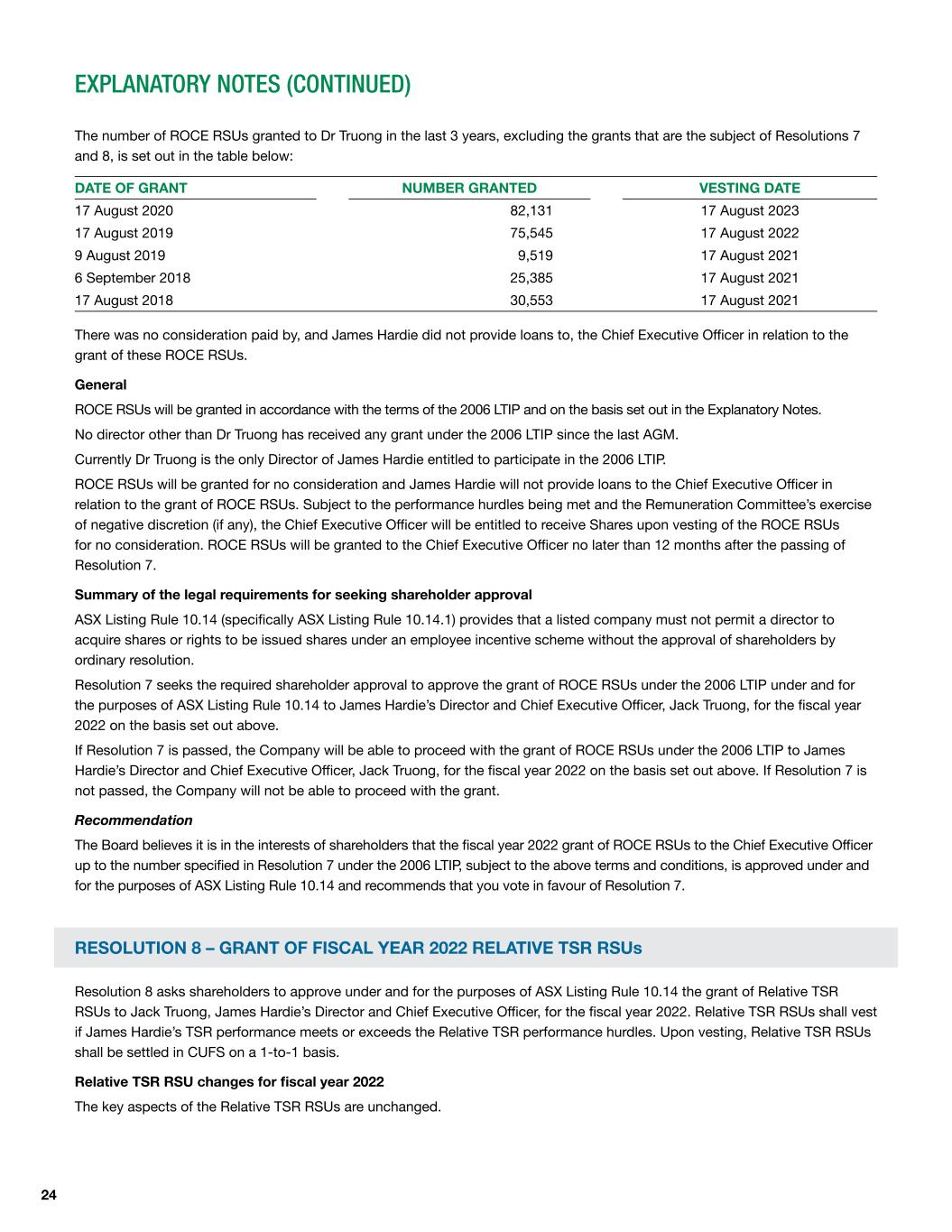 24 The number of ROCE RSUs granted to Dr Truong in the last 3 years, excluding the grants that are the subject of Resolutions 7 and 8, is set out in the table below: DATE OF GRANT NUMBER GRANTED VESTING DATE 17 August 2020 82,131 17 August 2023 17 August 2019 75,545 17 August 2022 9 August 2019 9,519 17 August 2021 6 September 2018 25,385 17 August 2021 17 August 2018 30,553 17 August 2021 There was no consideration paid by, and James Hardie did not provide loans to, the Chief Executive Officer in relation to the grant of these ROCE RSUs. General ROCE RSUs will be granted in accordance with the terms of the 2006 LTIP and on the basis set out in the Explanatory Notes. No director other than Dr Truong has received any grant under the 2006 LTIP since the last AGM. Currently Dr Truong is the only Director of James Hardie entitled to participate in the 2006 LTIP. ROCE RSUs will be granted for no consideration and James Hardie will not provide loans to the Chief Executive Officer in relation to the grant of ROCE RSUs. Subject to the performance hurdles being met and the Remuneration Committee’s exercise of negative discretion (if any), the Chief Executive Officer will be entitled to receive Shares upon vesting of the ROCE RSUs for no consideration. ROCE RSUs will be granted to the Chief Executive Officer no later than 12 months after the passing of Resolution 7. Summary of the legal requirements for seeking shareholder approval ASX Listing Rule 10.14 (specifically ASX Listing Rule 10.14.1) provides that a listed company must not permit a director to acquire shares or rights to be issued shares under an employee incentive scheme without the approval of shareholders by ordinary resolution. Resolution 7 seeks the required shareholder approval to approve the grant of ROCE RSUs under the 2006 LTIP under and for the purposes of ASX Listing Rule 10.14 to James Hardie’s Director and Chief Executive Officer, Jack Truong, for the fiscal year 2022 on the basis set out above. If Resolution 7 is passed, the Company will be able to proceed with the grant of ROCE RSUs under the 2006 LTIP to James Hardie’s Director and Chief Executive Officer, Jack Truong, for the fiscal year 2022 on the basis set out above. If Resolution 7 is not passed, the Company will not be able to proceed with the grant. Recommendation The Board believes it is in the interests of shareholders that the fiscal year 2022 grant of ROCE RSUs to the Chief Executive Officer up to the number specified in Resolution 7 under the 2006 LTIP, subject to the above terms and conditions, is approved under and for the purposes of ASX Listing Rule 10.14 and recommends that you vote in favour of Resolution 7. RESOLUTION 8 – GRANT OF FISCAL YEAR 2022 RELATIVE TSR RSUs Resolution 8 asks shareholders to approve under and for the purposes of ASX Listing Rule 10.14 the grant of Relative TSR RSUs to Jack Truong, James Hardie’s Director and Chief Executive Officer, for the fiscal year 2022. Relative TSR RSUs shall vest if James Hardie’s TSR performance meets or exceeds the Relative TSR performance hurdles. Upon vesting, Relative TSR RSUs shall be settled in CUFS on a 1-to-1 basis. Relative TSR RSU changes for fiscal year 2022 The key aspects of the Relative TSR RSUs are unchanged. EXPLANATORY NOTES (CONTINUED)