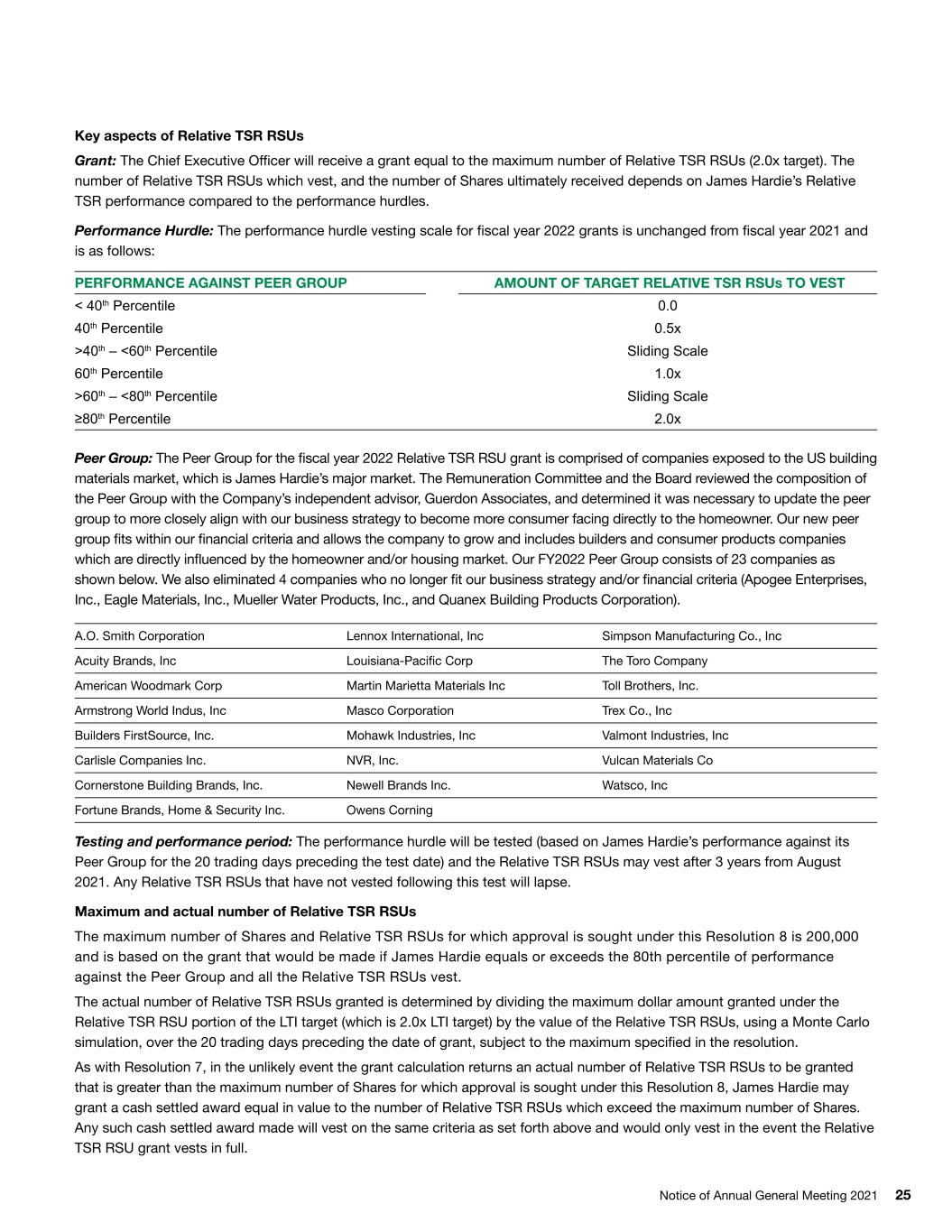 Notice of Annual General Meeting 2021 25 Key aspects of Relative TSR RSUs Grant: The Chief Executive Officer will receive a grant equal to the maximum number of Relative TSR RSUs (2.0x target). The number of Relative TSR RSUs which vest, and the number of Shares ultimately received depends on James Hardie’s Relative TSR performance compared to the performance hurdles. Performance Hurdle: The performance hurdle vesting scale for fiscal year 2022 grants is unchanged from fiscal year 2021 and is as follows: PERFORMANCE AGAINST PEER GROUP AMOUNT OF TARGET RELATIVE TSR RSUs TO VEST < 40th Percentile 0.0 40th Percentile 0.5x >40th – <60th Percentile Sliding Scale 60th Percentile 1.0x >60th – <80th Percentile Sliding Scale ≥80th Percentile 2.0x Peer Group: The Peer Group for the fiscal year 2022 Relative TSR RSU grant is comprised of companies exposed to the US building materials market, which is James Hardie’s major market. The Remuneration Committee and the Board reviewed the composition of the Peer Group with the Company’s independent advisor, Guerdon Associates, and determined it was necessary to update the peer group to more closely align with our business strategy to become more consumer facing directly to the homeowner. Our new peer group fits within our financial criteria and allows the company to grow and includes builders and consumer products companies which are directly influenced by the homeowner and/or housing market. Our FY2022 Peer Group consists of 23 companies as shown below. We also eliminated 4 companies who no longer fit our business strategy and/or financial criteria (Apogee Enterprises, Inc., Eagle Materials, Inc., Mueller Water Products, Inc., and Quanex Building Products Corporation). A.O. Smith Corporation Lennox International, Inc Simpson Manufacturing Co., Inc Acuity Brands, Inc Louisiana-Pacific Corp The Toro Company American Woodmark Corp Martin Marietta Materials Inc Toll Brothers, Inc. Armstrong World Indus, Inc Masco Corporation Trex Co., Inc Builders FirstSource, Inc. Mohawk Industries, Inc Valmont Industries, Inc Carlisle Companies Inc. NVR, Inc. Vulcan Materials Co Cornerstone Building Brands, Inc. Newell Brands Inc. Watsco, Inc Fortune Brands, Home & Security Inc. Owens Corning Testing and performance period: The performance hurdle will be tested (based on James Hardie’s performance against its Peer Group for the 20 trading days preceding the test date) and the Relative TSR RSUs may vest after 3 years from August 2021. Any Relative TSR RSUs that have not vested following this test will lapse. Maximum and actual number of Relative TSR RSUs The maximum number of Shares and Relative TSR RSUs for which approval is sought under this Resolution 8 is 200,000 and is based on the grant that would be made if James Hardie equals or exceeds the 80th percentile of performance against the Peer Group and all the Relative TSR RSUs vest. The actual number of Relative TSR RSUs granted is determined by dividing the maximum dollar amount granted under the Relative TSR RSU portion of the LTI target (which is 2.0x LTI target) by the value of the Relative TSR RSUs, using a Monte Carlo simulation, over the 20 trading days preceding the date of grant, subject to the maximum specified in the resolution. As with Resolution 7, in the unlikely event the grant calculation returns an actual number of Relative TSR RSUs to be granted that is greater than the maximum number of Shares for which approval is sought under this Resolution 8, James Hardie may grant a cash settled award equal in value to the number of Relative TSR RSUs which exceed the maximum number of Shares. Any such cash settled award made will vest on the same criteria as set forth above and would only vest in the event the Relative TSR RSU grant vests in full.