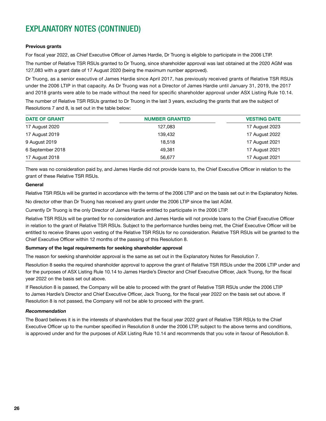 26 Previous grants For fiscal year 2022, as Chief Executive Officer of James Hardie, Dr Truong is eligible to participate in the 2006 LTIP. The number of Relative TSR RSUs granted to Dr Truong, since shareholder approval was last obtained at the 2020 AGM was 127,083 with a grant date of 17 August 2020 (being the maximum number approved). Dr Truong, as a senior executive of James Hardie since April 2017, has previously received grants of Relative TSR RSUs under the 2006 LTIP in that capacity. As Dr Truong was not a Director of James Hardie until January 31, 2019, the 2017 and 2018 grants were able to be made without the need for specific shareholder approval under ASX Listing Rule 10.14. The number of Relative TSR RSUs granted to Dr Truong in the last 3 years, excluding the grants that are the subject of Resolutions 7 and 8, is set out in the table below: DATE OF GRANT NUMBER GRANTED VESTING DATE 17 August 2020 127,083 17 August 2023 17 August 2019 139,432 17 August 2022 9 August 2019 18,518 17 August 2021 6 September 2018 49,381 17 August 2021 17 August 2018 56,677 17 August 2021 There was no consideration paid by, and James Hardie did not provide loans to, the Chief Executive Officer in relation to the grant of these Relative TSR RSUs. General Relative TSR RSUs will be granted in accordance with the terms of the 2006 LTIP and on the basis set out in the Explanatory Notes. No director other than Dr Truong has received any grant under the 2006 LTIP since the last AGM. Currently Dr Truong is the only Director of James Hardie entitled to participate in the 2006 LTIP. Relative TSR RSUs will be granted for no consideration and James Hardie will not provide loans to the Chief Executive Officer in relation to the grant of Relative TSR RSUs. Subject to the performance hurdles being met, the Chief Executive Officer will be entitled to receive Shares upon vesting of the Relative TSR RSUs for no consideration. Relative TSR RSUs will be granted to the Chief Executive Officer within 12 months of the passing of this Resolution 8. Summary of the legal requirements for seeking shareholder approval The reason for seeking shareholder approval is the same as set out in the Explanatory Notes for Resolution 7. Resolution 8 seeks the required shareholder approval to approve the grant of Relative TSR RSUs under the 2006 LTIP under and for the purposes of ASX Listing Rule 10.14 to James Hardie’s Director and Chief Executive Officer, Jack Truong, for the fiscal year 2022 on the basis set out above. If Resolution 8 is passed, the Company will be able to proceed with the grant of Relative TSR RSUs under the 2006 LTIP to James Hardie’s Director and Chief Executive Officer, Jack Truong, for the fiscal year 2022 on the basis set out above. If Resolution 8 is not passed, the Company will not be able to proceed with the grant. Recommendation The Board believes it is in the interests of shareholders that the fiscal year 2022 grant of Relative TSR RSUs to the Chief Executive Officer up to the number specified in Resolution 8 under the 2006 LTIP, subject to the above terms and conditions, is approved under and for the purposes of ASX Listing Rule 10.14 and recommends that you vote in favour of Resolution 8. EXPLANATORY NOTES (CONTINUED)