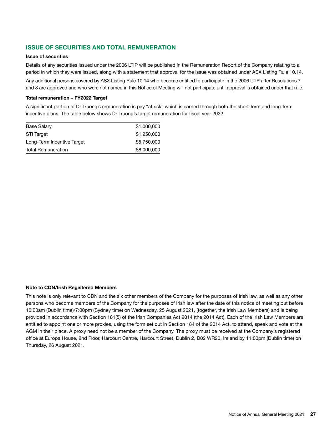Notice of Annual General Meeting 2021 27 ISSUE OF SECURITIES AND TOTAL REMUNERATION Issue of securities Details of any securities issued under the 2006 LTIP will be published in the Remuneration Report of the Company relating to a period in which they were issued, along with a statement that approval for the issue was obtained under ASX Listing Rule 10.14. Any additional persons covered by ASX Listing Rule 10.14 who become entitled to participate in the 2006 LTIP after Resolutions 7 and 8 are approved and who were not named in this Notice of Meeting will not participate until approval is obtained under that rule. Total remuneration – FY2022 Target A significant portion of Dr Truong’s remuneration is pay “at risk” which is earned through both the short-term and long-term incentive plans. The table below shows Dr Truong’s target remuneration for fiscal year 2022. Base Salary $1,000,000 STI Target $1,250,000 Long-Term Incentive Target $5,750,000 Total Remuneration $8,000,000 Note to CDN/Irish Registered Members This note is only relevant to CDN and the six other members of the Company for the purposes of Irish law, as well as any other persons who become members of the Company for the purposes of Irish law after the date of this notice of meeting but before 10:00am (Dublin time)/7:00pm (Sydney time) on Wednesday, 25 August 2021, (together, the Irish Law Members) and is being provided in accordance with Section 181(5) of the Irish Companies Act 2014 (the 2014 Act). Each of the Irish Law Members are entitled to appoint one or more proxies, using the form set out in Section 184 of the 2014 Act, to attend, speak and vote at the AGM in their place. A proxy need not be a member of the Company. The proxy must be received at the Company’s registered office at Europa House, 2nd Floor, Harcourt Centre, Harcourt Street, Dublin 2, D02 WR20, Ireland by 11:00pm (Dublin time) on Thursday, 26 August 2021.