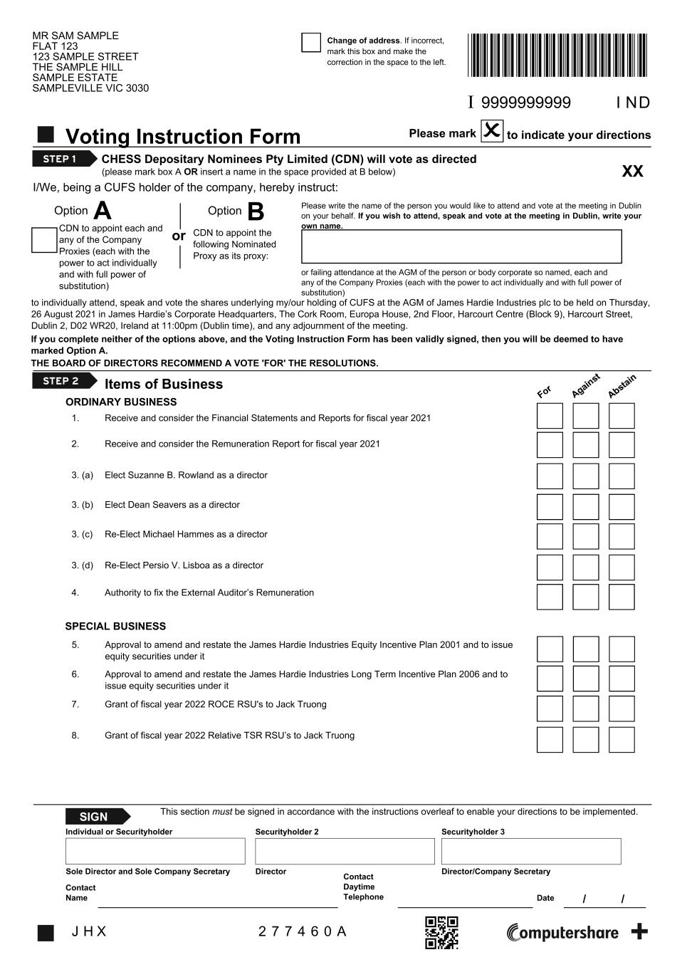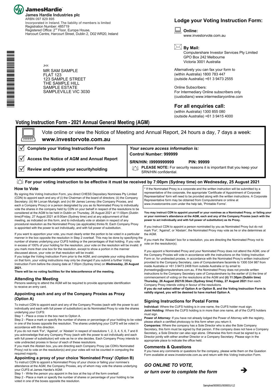 SRN/HIN: I9999999999 * If the Nominated Proxy is a corporate and the written instruction will be submitted by a representative of the corporate, the appropriate 'Certificate of Appointment of Corporate Representative' form will need to be provided along with the written instructions. A Corporate Representative form may be obtained from Computershare or online at www.investorcentre.com under the help tab, 'Printable Forms'. If you want to apportion your vote, you must clearly enter the portion to be voted in a particular manner in the box opposite the resolution in Step 2 overleaf. This may be done by specifying the number of shares underlying your CUFS holding or the percentages of that holding. If you vote in excess of 100% of your holding for the resolution, your vote on the resolution will be invalid. If you mark more than one box for the resolution, except to show a portion in the manner discussed above, your vote on that resolution will be invalid. If you lodge the Voting Instruction Form prior to the AGM, and complete your voting directions on that form, your voting instructions may only be changed if you submit a further Voting Instruction Form before the closing date at 7:00pm (Sydney time) on Wednesday, 25 August 2021. There will be no voting facilities for the teleconference of the meeting. If you instruct CDN to appoint a person nominated by you as Nominated Proxy but do not mark 'For', 'Against', or 'Abstain', the Nominated Proxy may vote as he or she determines at the AGM. To instruct CDN to appoint each and any of the Company Proxies (each with the power to act individually and each with full power of substitution) as its Nominated Proxy to vote the shares underlying your CUFS: Step 1 - Place a cross in the box next to Option A. Step 2 - Place a mark or specify the number of shares or percentage of your holding to be voted in one of the boxes opposite the resolution. The shares underlying your CUFS will be voted in accordance with this direction. If you do not mark 'For', 'Against', or 'Abstain' in respect of resolutions 1, 2, 3, 4, 5, 6, 7 and 8 you acknowledge that any Company Proxy (each with the power to act individually and each with full power of substitution) will vote as he or she decides. Each Company Proxy intends to vote undirected proxies in favour of each of these resolutions. If you mark the Abstain box, you are directing each Company Proxy (as CDN's Nominated Proxy) not to vote on the resolution(s) and your votes will not be counted in computing the required majority. Persons seeking to attend the AGM will be required to provide appropriate identification to receive an entry card. Individual: Where the CUFS holding is in one name, the CUFS holder must sign. Joint Holding: Where the CUFS holding is in more than one name, all of the CUFS holders must sign. Power of Attorney: If you have not already lodged the Power of Attorney with the registry, please attach a certified photocopy to this form when you return it. Companies: Where the company has a Sole Director who is also the Sole Company Secretary, this form must be signed by that person. If the company does not have a Company Secretary, a Sole Director can also sign alone. Otherwise this form must be signed by a Director jointly with either another Director or a Company Secretary. Please sign in the appropriate place to indicate the office held. To instruct CDN to appoint a Nominated Proxy of your choice or failing your nominee’s attendance at the AGM, the Company Proxies, any of whom may vote the shares underlying your CUFS at James Hardie's AGM: Step 1 - Write the person you appoint in the box at the top of the form overleaf. Step 2 - Place a mark or specify the number of shares or percentage of your holding to be voted in one of the boxes opposite the resolution. If you have any comments or questions for the company, please write them on the Question Form available at www.investorvote.com.au and return with this Voting Instruction Form. Lodge your Voting Instruction Form: Online: www.investorvote.com.au By Mail: Computershare Investor Services Pty Limited GPO Box 242 Melbourne Victoria 3001 Australia Alternatively you can fax your form to (within Australia) 1800 783 447 (outside Australia) +61 3 9473 2555 For all enquiries call: (within Australia) 1300 855 080 (outside Australia) +61 3 9415 4000 Voting Instruction Form - 2021 Annual General Meeting (AGM) For your voting instruction to be effective it must be received by 7:00pm (Sydney time) on Wednesday, 25 August 2021 How to Vote Signing Instructions for Postal Forms GO ONLINE TO VOTE, or turn over to complete the form Control Number: 999999 PIN: 99999 www.investorvote.com.au Vote online or view the Notice of Meeting and Annual Report, 24 hours a day, 7 days a week: Complete your Voting Instruction Form Access the Notice of AGM and Annual Report Review and update your securityholding Your secure access information is: PLEASE NOTE: For security reasons it is important that you keep your SRN/HIN confidential. By signing this Voting Instruction Form, you direct CHESS Depositary Nominees Pty Limited (CDN) to appoint each and any of (i) the Chairman of the board of directors; (ii) the Company Secretary; (iii) Mr Lorcan Murtagh; and (iv) Mr James Lenney (the Company Proxies, and each a Company Proxy) or a person designated by you as its Nominated Proxy to individually vote the shares in the company held by CDN on your behalf in respect of the resolutions to be considered at the AGM to be held in Dublin on Thursday, 26 August 2021 at 11:00pm (Dublin time)/Friday, 27 August 2021 at 8:00am (Sydney time) and at any adjournment of that meeting, as indicated on this form, and to individually vote or abstain in respect of any procedural resolution as the Nominated Proxy (as applicable) thinks fit. Each Company Proxy is appointed with the power to act individually, and with full power of substitution. Appointing each and any of the Company Proxies as Proxy (Option A