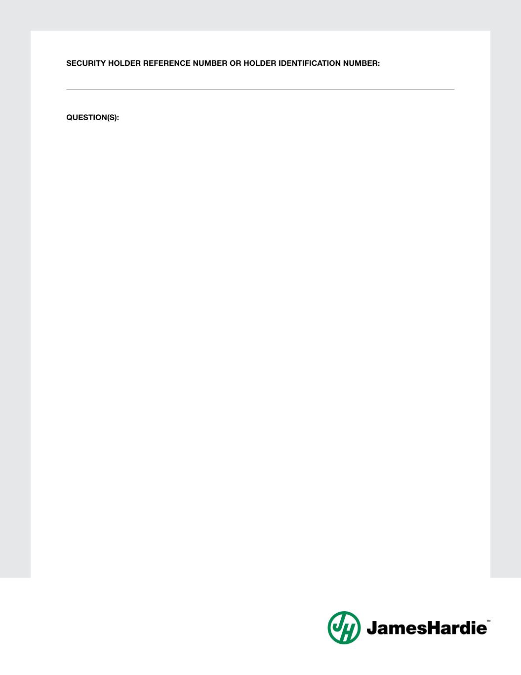 WE WELCOME YOUR QUESTIONS Question Form We want to make it easy for as many James Hardie shareholders as possible to ask questions of the Company’s Directors. Please use the other side of this form to send us any questions you would like answered at the Annual General Meeting to be held on Thursday, 26 August 2021, in Dublin, Ireland. We believe this process will make it easier for more shareholders to have questions answered, whether or not they can attend the meeting. You will also be able to ask questions through the teleconference facility. We will attempt to answer as many questions as possible in the addresses by the Chairman and the CEO. If we receive a large number of questions from holders, we may not be able to reply individually. Please use this form even if you will be attending the meeting. To return this form to us, please: Email this form by Tuesday, 24 August 2021 to: [email protected] PLEASE PROVIDE YOUR DETAILS BELOW Holder’s name: Address: Security Holder Reference Number or Holder Identification Number: