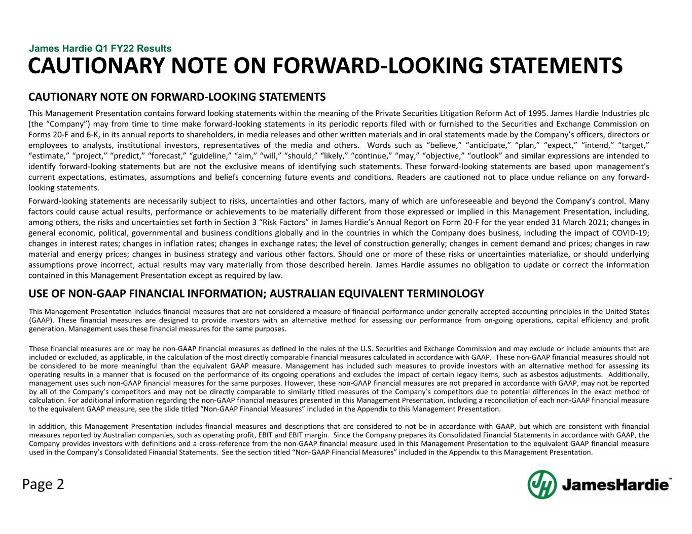 Page 2 James Hardie Q1 FY22 Results CAUTIONARY NOTE ON FORWARD‐LOOKING STATEMENTS This Management Presentation contains forward looking statements within the meaning of the Private Securities Litigation Reform Act of 1995. James Hardie Industries plc (the “Company”) may from time to time make forward‐looking statements in its periodic reports filed with or furnished to the Securities and Exchange Commission on Forms 20‐F and 6‐K, in its annual reports to shareholders, in media releases and other written materials and in oral statements made by the Company’s officers, directors or employees to analysts, institutional investors, representatives of the media and others. Words such as “believe,” “anticipate,” “plan,” “expect,” “intend,” “target,” “estimate,” “project,” “predict,” “forecast,” “guideline,” “aim,” “will,” “should,” “likely,” “continue,” “may,” “objective,” “outlook” and similar expressions are intended to identify forward‐looking statements but are not the exclusive means of identifying such statements. These forward‐looking statements are based upon management's current expectations, estimates, assumptions and beliefs concerning future events and conditions. Readers are cautioned not to place undue reliance on any forward‐ looking statements. Forward‐looking statements are necessarily subject to risks, uncertainties and other factors, many of which are unforeseeable and beyond the Company’s control. Many factors could cause actual results, performance or achievements to be materially different from those expressed or implied in this Management Presentation, including, among others, the risks and uncertainties set forth in Section 3 “Risk Factors” in James Hardie’s Annual Report on Form 20‐F for the year ended 31 March 2021; changes in general economic, political, governmental and business conditions globally and in the countries in which the Company does business, including the impact of COVID‐19; changes in interest rates; changes in inflation rates; changes in exchange rates; the level of construction generally; changes in cement demand and prices; changes in raw material and energy prices; changes in business strategy and various other factors. Should one or more of these risks or uncertainties materialize, or should underlying assumptions prove incorrect, actual results may vary materially from those described herein. James Hardie assumes no obligation to update or correct the information contained in this Management Presentation except as required by law. This Management Presentation includes financial measures that are not considered a measure of financial performance under generally accepted accounting principles in the United States (GAAP). These financial measures are designed to provide investors with an alternative method for assessing our performance from on‐going operations, capital efficiency and profit generation. Management uses these financial measures for the same purposes. These financial measures are or may be non‐GAAP financial measures as defined in the rules of the U.S. Securities and Exchange Commission and may exclude or include amounts that are included or excluded, as applicable, in the calculation of the most directly comparable financial measures calculated in accordance with GAAP. These non‐GAAP financial measures should not be considered to be more meaningful than the equivalent GAAP measure. Management has included such measures to provide investors with an alternative method for assessing its operating results in a manner that is focused on the performance of its ongoing operations and excludes the impact of certain legacy items, such as asbestos adjustments. Additionally, management uses such non‐GAAP financial measures for the same purposes. However, these non‐GAAP financial measures are not prepared in accordance with GAAP, may not be reported by all of the Company’s competitors and may not be directly comparable to similarly titled measures of the Company’s competitors due to potential differences in the exact method of calculation. For additional information regarding the non‐GAAP financial measures presented in this Management Presentation, including a reconciliation of each non‐GAAP financial measure to the equivalent GAAP measure, see the slide titled “Non‐GAAP Financial Measures” included in the Appendix to this Management Presentation. In addition, this Management Presentation includes financial measures and descriptions that are considered to not be in accordance with GAAP, but which are consistent with financial measures reported by Australian companies, such as operating profit, EBIT and EBIT margin. Since the Company prepares its Consolidated Financial Statements in accordance with GAAP, the Company provides investors with definitions and a cross‐reference from the non‐GAAP financial measure used in this Management Presentation to the equivalent GAAP financial measure used in the Company’s Consolidated Financial Statements. See the section titled “Non‐GAAP Financial Measures” included in the Appendix to this Management Presentation. CAUTIONARY NOTE ON FORWARD‐LOOKING STATEMENTS USE OF NON‐GAAP FINANCIAL INFORMATION; AUSTRALIAN EQUIVALENT TERMINOLOGY