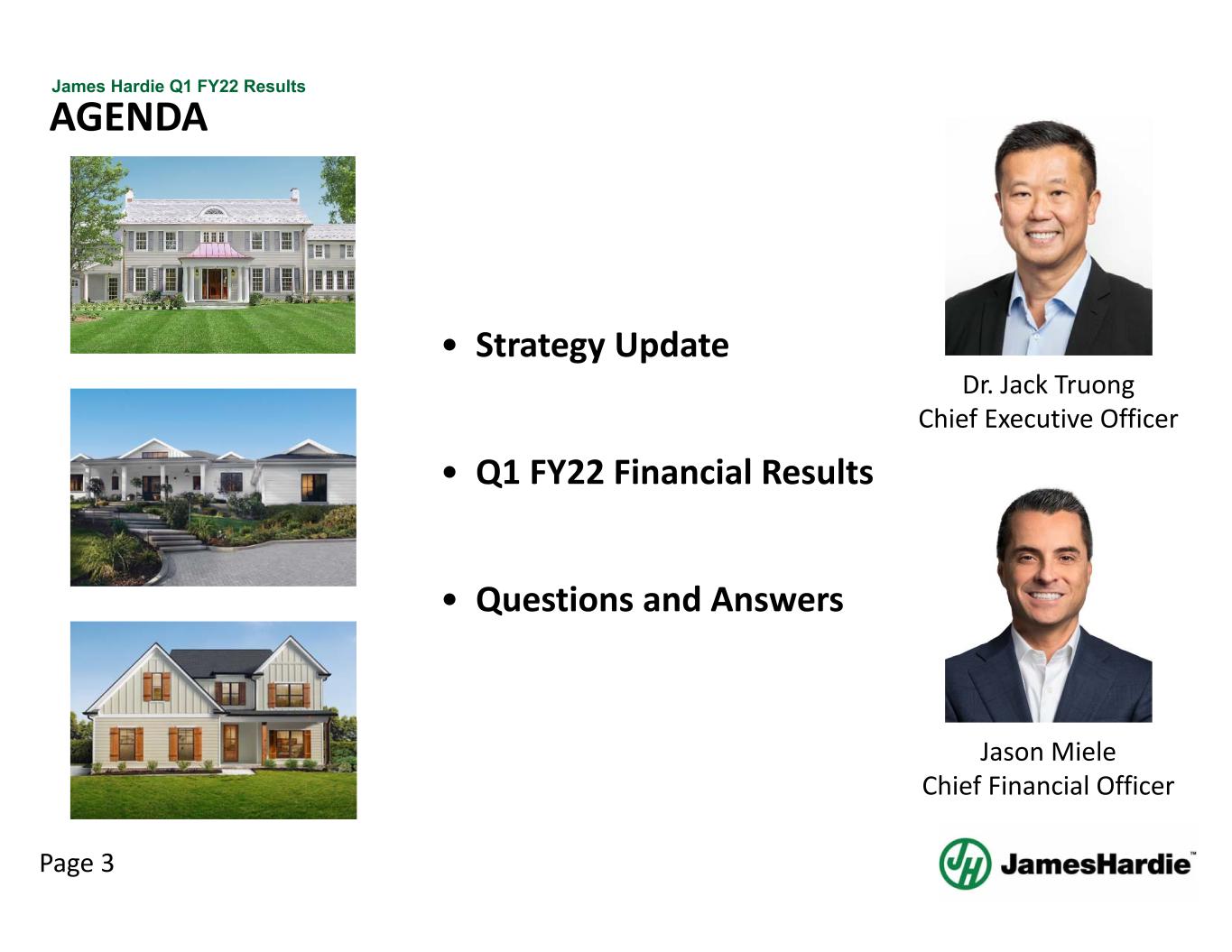 Page 3 James Hardie Q1 FY22 Results AGENDA • Strategy Update • Q1 FY22 Financial Results • Questions and Answers Dr. Jack Truong Chief Executive Officer Jason Miele Chief Financial Officer