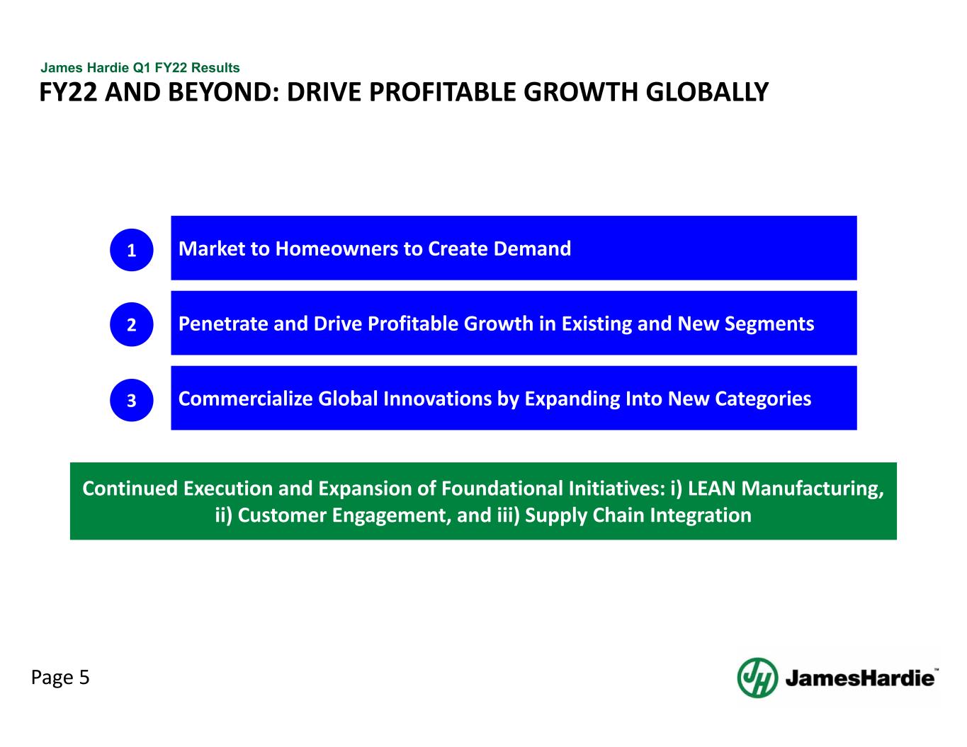 Page 5 James Hardie Q1 FY22 Results FY22 AND BEYOND: DRIVE PROFITABLE GROWTH GLOBALLY Market to Homeowners to Create Demand Penetrate and Drive Profitable Growth in Existing and New Segments Commercialize Global Innovations by Expanding Into New Categories Continued Execution and Expansion of Foundational Initiatives: i) LEAN Manufacturing, ii) Customer Engagement, and iii) Supply Chain Integration 1 2 3