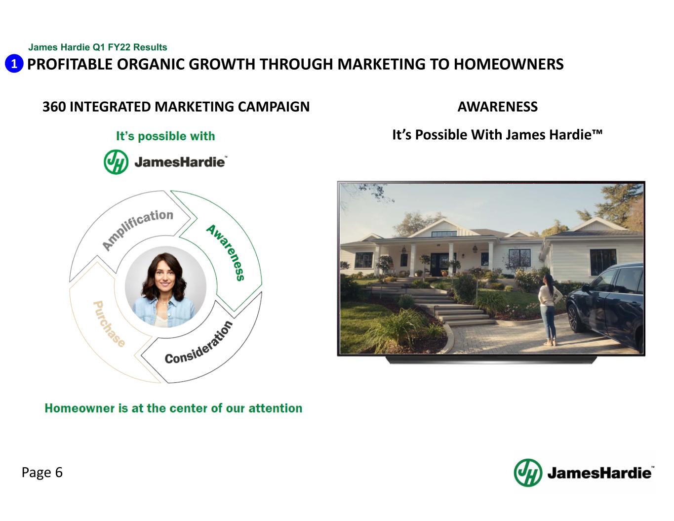 Page 6 James Hardie Q1 FY22 Results PROFITABLE ORGANIC GROWTH THROUGH MARKETING TO HOMEOWNERS 360 INTEGRATED MARKETING CAMPAIGN AWARENESS It’s Possible With James Hardie™ 1