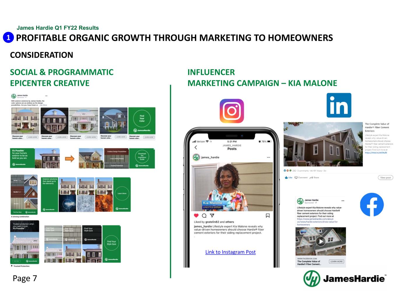 Page 7 James Hardie Q1 FY22 Results SOCIAL & PROGRAMMATIC EPICENTER CREATIVE INFLUENCER MARKETING CAMPAIGN – KIA MALONE PROFITABLE ORGANIC GROWTH THROUGH MARKETING TO HOMEOWNERS1 CONSIDERATION Link to Instagram Post