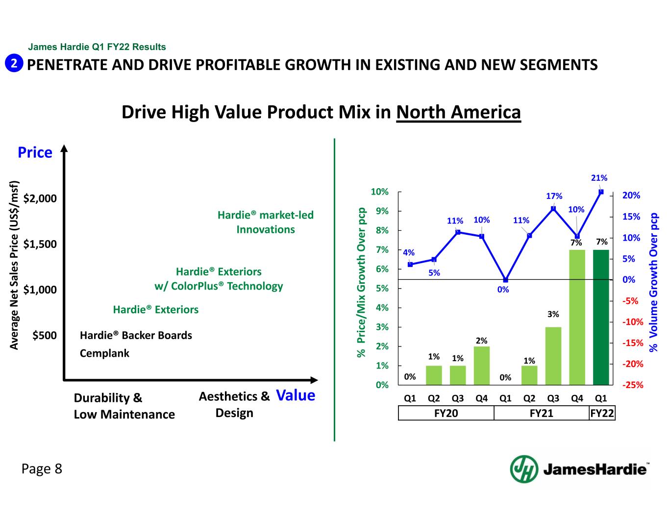 Page 8 James Hardie Q1 FY22 Results 0% 1% 1% 2% 0% 1% 3% 7% 7% 4% 5% 11% 10% 0% 11% 17% 10% 21% ‐25% ‐20% ‐15% ‐10% ‐5% 0% 5% 10% 15% 20% 0% 1% 2% 3% 4% 5% 6% 7% 8% 9% 10% Q1 Q2 Q3 Q4 Q1 Q2 Q3 Q4 Q1 PENETRATE AND DRIVE PROFITABLE GROWTH IN EXISTING AND NEW SEGMENTS % V ol um e G ro w th O ve r p cp Hardie® Backer Boards Cemplank Hardie® Exteriors Hardie® Exteriors w/ ColorPlus® Technology Hardie® market‐led Innovations Durability & Low Maintenance ValueAesthetics & Design Av er ag e N et S al es P ric e (U S$ /m sf ) $2,000 Price $500 $1,000 $1,500 FY20 FY21 FY22 % P ric e/ M ix G ro w th O ve r p cp 2 Drive High Value Product Mix in North America