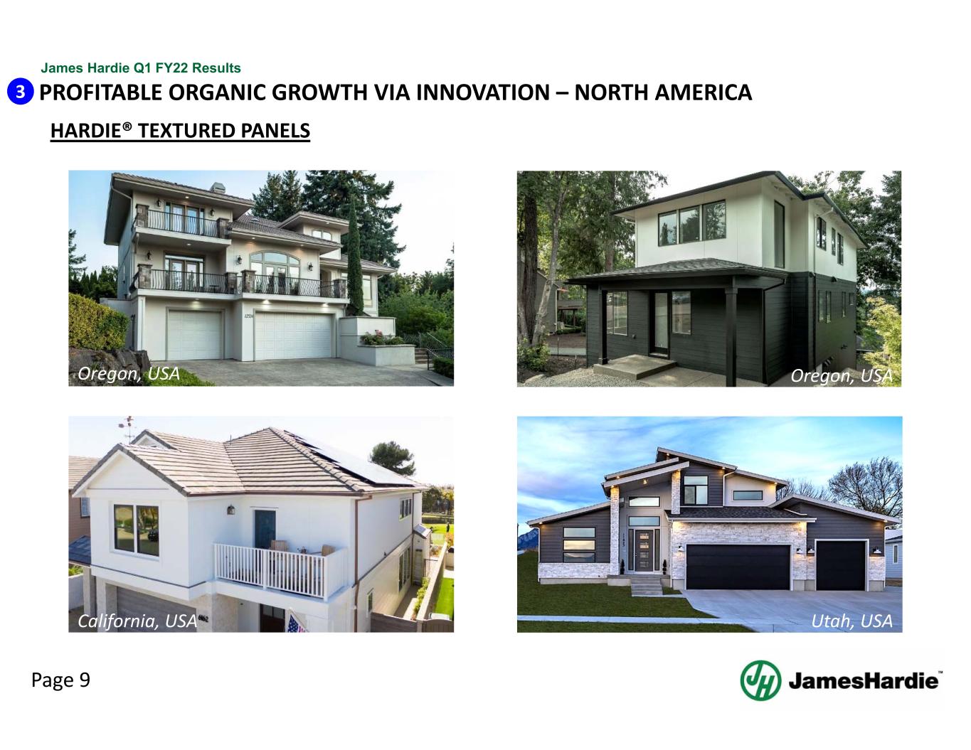 Page 9 James Hardie Q1 FY22 Results Oregon, USAOregon, USA California, USA PROFITABLE ORGANIC GROWTH VIA INNOVATION – NORTH AMERICA HARDIE® TEXTURED PANELS Utah, USA 3