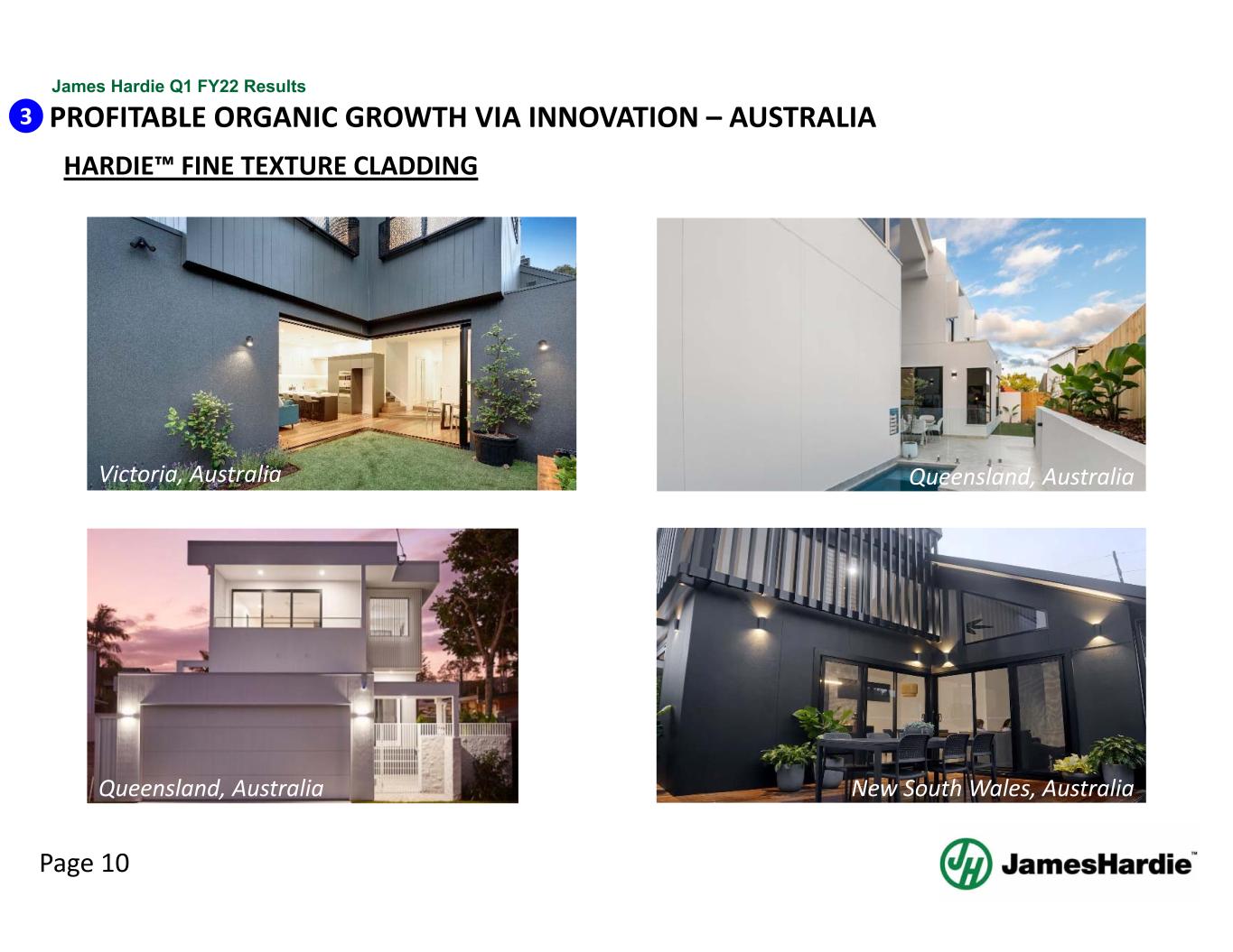 Page 10 James Hardie Q1 FY22 Results Queensland, AustraliaVictoria, Australia New South Wales, Australia PROFITABLE ORGANIC GROWTH VIA INNOVATION – AUSTRALIA HARDIE™ FINE TEXTURE CLADDING 3 Queensland, Australia