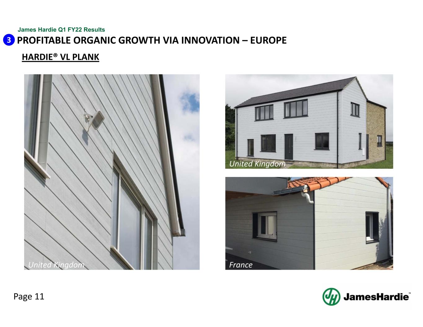 Page 11 James Hardie Q1 FY22 Results United Kingdom France HARDIE® VL PLANK PROFITABLE ORGANIC GROWTH VIA INNOVATION – EUROPE3 United Kingdom