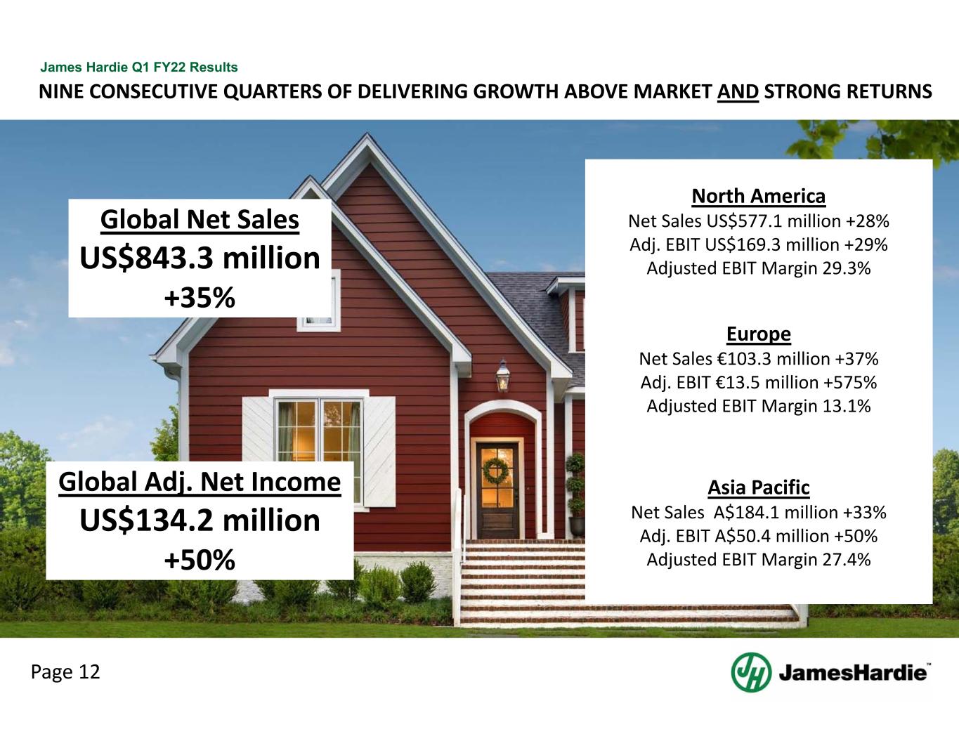 Page 12 James Hardie Q1 FY22 Results Global Net Sales US$843.3 million +35% Global Adj. Net Income US$134.2 million +50% All Europe Net Sales €103.3 million +37% Adj. EBIT €13.5 million +575% Adjusted EBIT Margin 13.1% North America Net Sales US$577.1 million +28% Adj. EBIT US$169.3 million +29% Adjusted EBIT Margin 29.3% Asia Pacific Net Sales A$184.1 million +33% Adj. EBIT A$50.4 million +50% Adjusted EBIT Margin 27.4% NINE CONSECUTIVE QUARTERS OF DELIVERING GROWTH ABOVE MARKET AND STRONG RETURNS