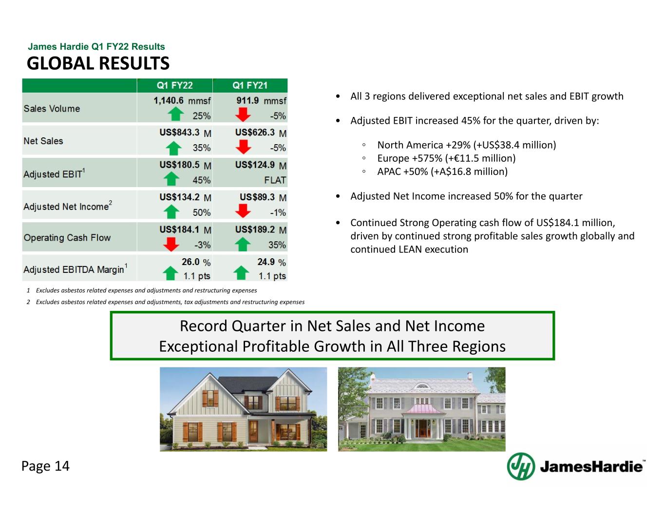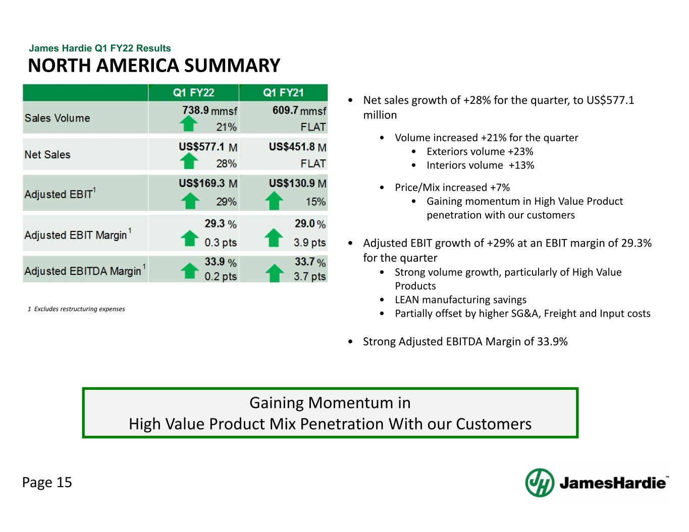 Page 14 James Hardie Q1 FY22 Results • All 3 regions delivered exceptional net sales and EBIT growth • Adjusted EBIT increased 45% for the quarter, driven by: ◦ North America +29% (+US$38.4 million) ◦ Europe +575% (+€11.5 million) ◦ APAC +50% (+A$16.8 million) • Adjusted Net Income increased 50% for the quarter • Continued Strong Operating cash flow of US$184.1 million, driven by continued strong profitable sales growth globally and continued LEAN execution GLOBAL RESULTS 1 Excludes asbestos related expenses and adjustments and restructuring expenses 2 Excludes asbestos related expenses and adjustments, tax adjustments and restructuring expenses Record Quarter in Net Sales and Net Income Exceptional Profitable Growth in All Three Regions