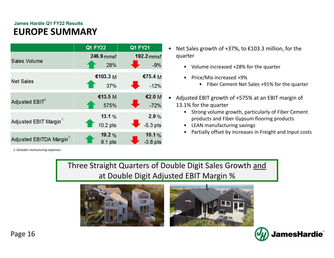 Page 15 James Hardie Q1 FY22 Results NORTH AMERICA SUMMARY Gaining Momentum in High Value Product Mix Penetration With our Customers • Net sales growth of +28% for the quarter, to US$577.1 million • Volume increased +21% for the quarter • Exteriors volume +23% • Interiors volume +13% • Price/Mix increased +7% • Gaining momentum in High Value Product penetration with our customers • Adjusted EBIT growth of +29% at an EBIT margin of 29.3% for the quarter • Strong volume growth, particularly of High Value Products • LEAN manufacturing savings • Partially offset by higher SG&A, Freight and Input costs • Strong Adjusted EBITDA Margin of 33.9% 1 Excludes restructuring expenses