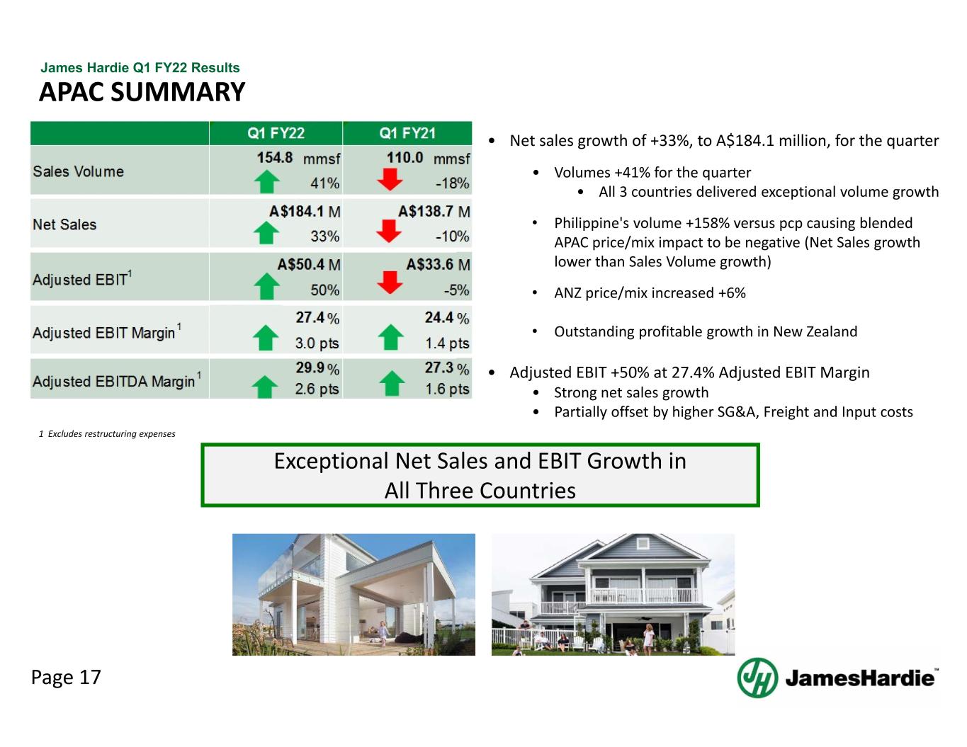 Page 17 James Hardie Q1 FY22 Results APAC SUMMARY • Net sales growth of +33%, to A$184.1 million, for the quarter • Volumes +41% for the quarter • All 3 countries delivered exceptional volume growth • Philippine's volume +158% versus pcp causing blended APAC price/mix impact to be negative (Net Sales growth lower than Sales Volume growth) • ANZ price/mix increased +6% • Outstanding profitable growth in New Zealand • Adjusted EBIT +50% at 27.4% Adjusted EBIT Margin • Strong net sales growth • Partially offset by higher SG&A, Freight and Input costs Exceptional Net Sales and EBIT Growth in All Three Countries 1 Excludes restructuring expenses