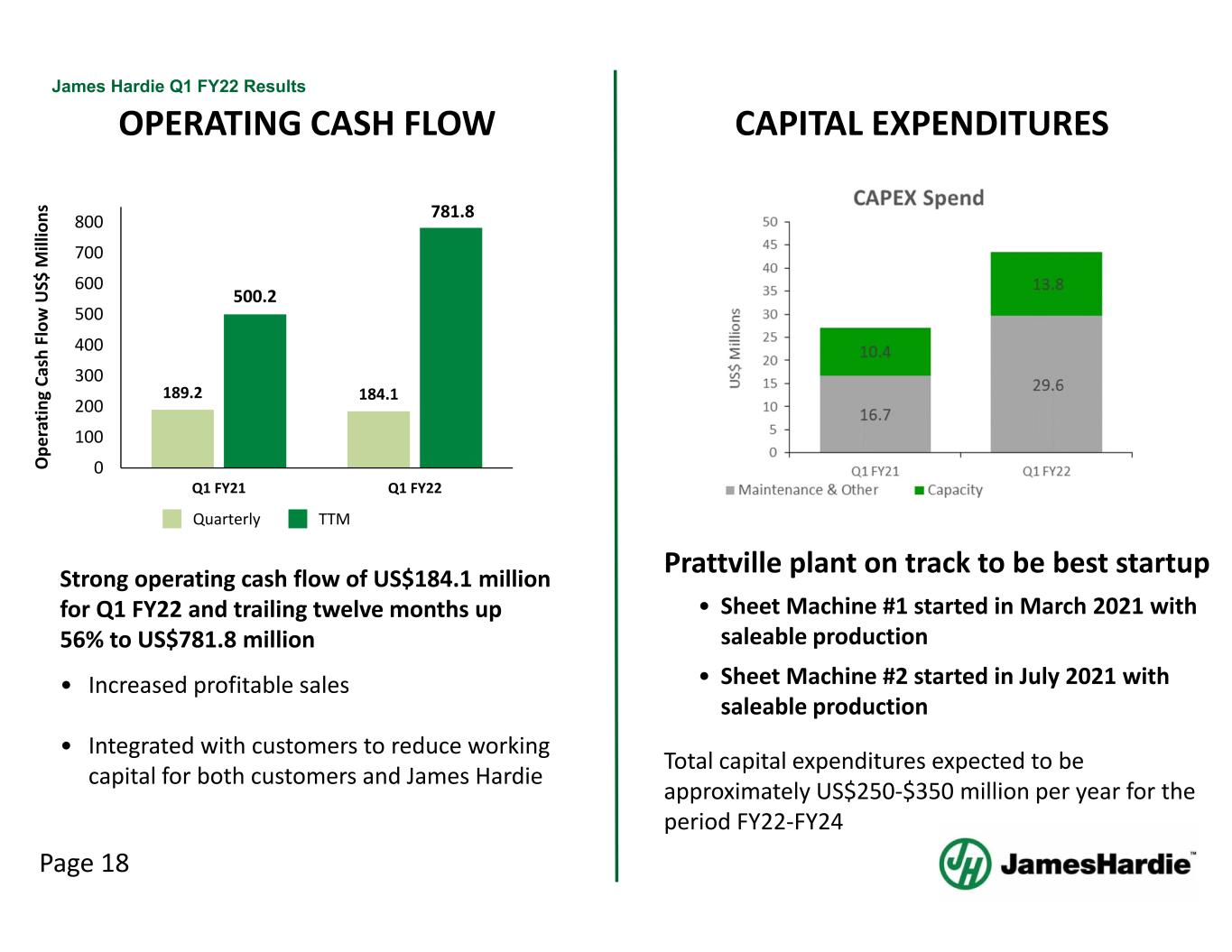 Page 18 James Hardie Q1 FY22 Results 1 OPERATING CASH FLOW CAPITAL EXPENDITURES Prattville plant on track to be best startup • Sheet Machine #1 started in March 2021 with saleable production • Sheet Machine #2 started in July 2021 with saleable production Strong operating cash flow of US$184.1 million for Q1 FY22 and trailing twelve months up 56% to US$781.8 million • Increased profitable sales • Integrated with customers to reduce working capital for both customers and James Hardie O pe ra tin g Ca sh F lo w U S$ M ill io ns 189.2 184.1 500.2 781.8 0 100 200 300 400 500 600 700 800 Q1 FY21 Q1 FY22 Quarterly TTM Total capital expenditures expected to be approximately US$250‐$350 million per year for the period FY22‐FY24