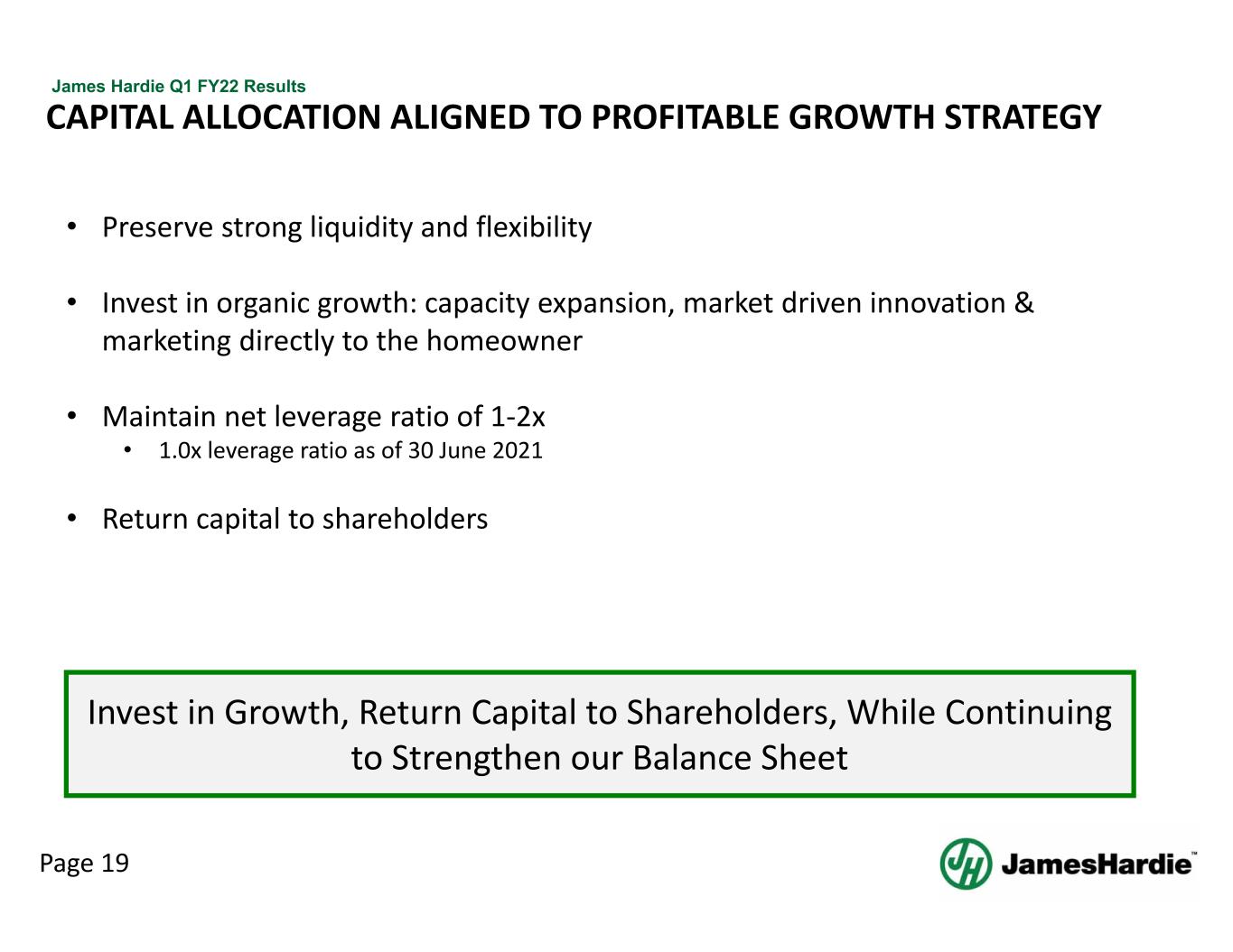 Page 19 James Hardie Q1 FY22 Results CAPITAL ALLOCATION ALIGNED TO PROFITABLE GROWTH STRATEGY Invest in Growth, Return Capital to Shareholders, While Continuing to Strengthen our Balance Sheet • Preserve strong liquidity and flexibility • Invest in organic growth: capacity expansion, market driven innovation & marketing directly to the homeowner • Maintain net leverage ratio of 1‐2x • 1.0x leverage ratio as of 30 June 2021 • Return capital to shareholders