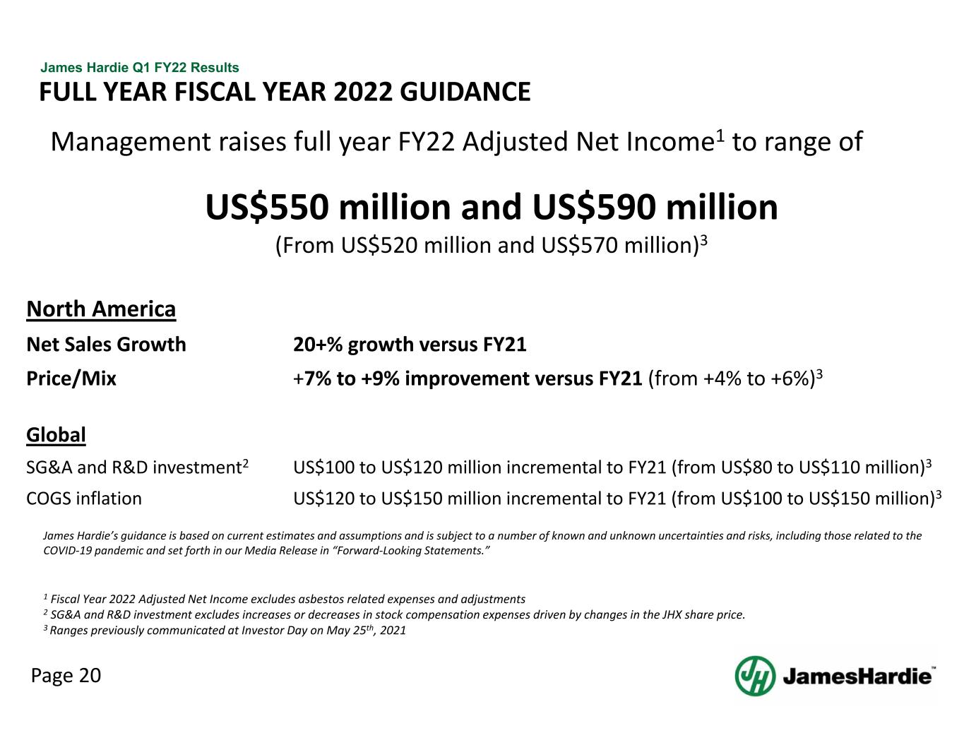 Page 20 James Hardie Q1 FY22 Results FULL YEAR FISCAL YEAR 2022 GUIDANCE PNW, USA Management raises full year FY22 Adjusted Net Income1 to range of US$550 million and US$590 million (From US$520 million and US$570 million)3 North America Net Sales Growth 20+% growth versus FY21 Price/Mix +7% to +9% improvement versus FY21 (from +4% to +6%)3 Global SG&A and R&D investment2 US$100 to US$120 million incremental to FY21 (from US$80 to US$110 million)3 COGS inflation US$120 to US$150 million incremental to FY21 (from US$100 to US$150 million)3 James Hardie’s guidance is based on current estimates and assumptions and is subject to a number of known and unknown uncertainties and risks, including those related to the COVID‐19 pandemic and set forth in our Media Release in “Forward‐Looking Statements.” 1 Fiscal Year 2022 Adjusted Net Income excludes asbestos related expenses and adjustments 2 SG&A and R&D investment excludes increases or decreases in stock compensation expenses driven by changes in the JHX share price. 3 Ranges previously communicated at Investor Day on May 25th, 2021