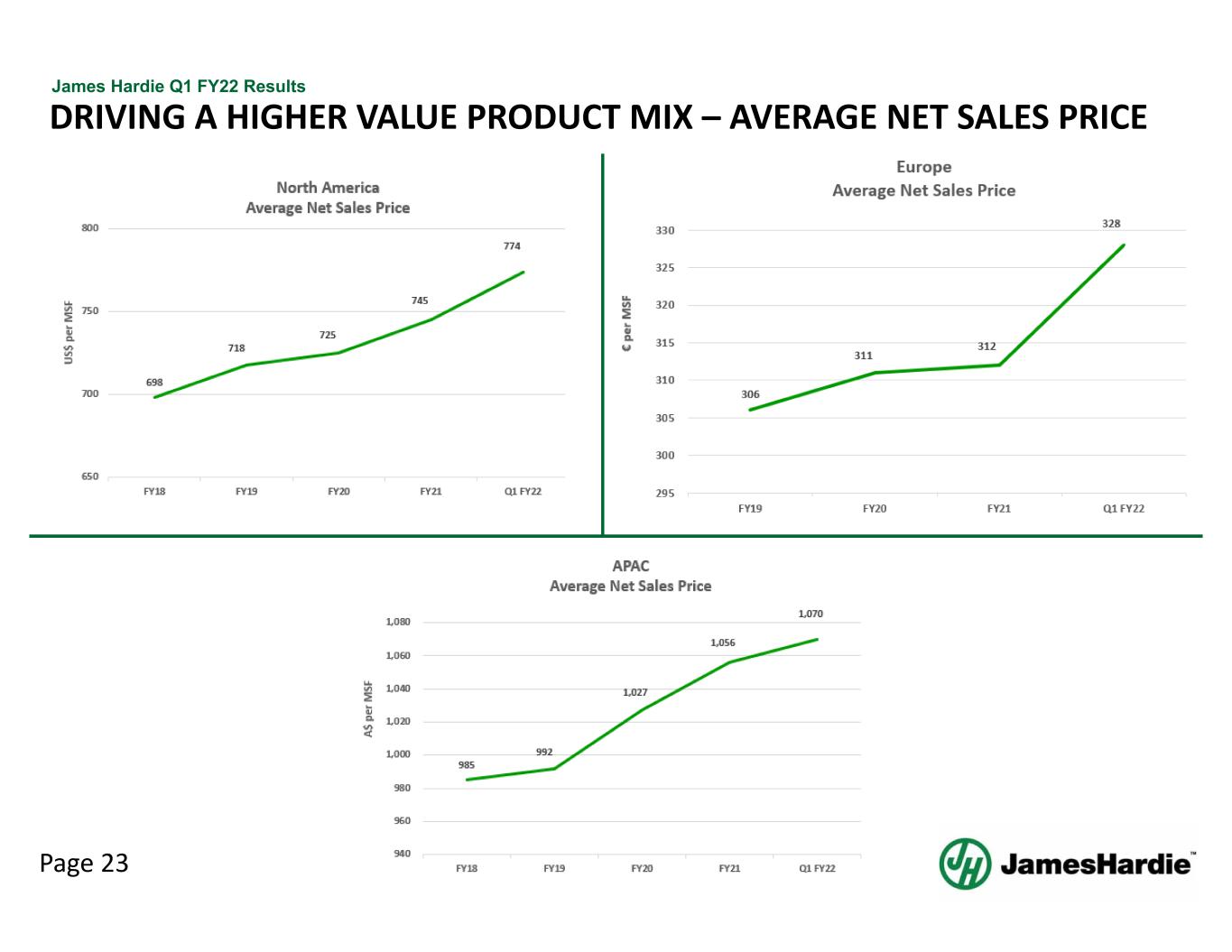 Page 23 James Hardie Q1 FY22 Results DRIVING A HIGHER VALUE PRODUCT MIX – AVERAGE NET SALES PRICE