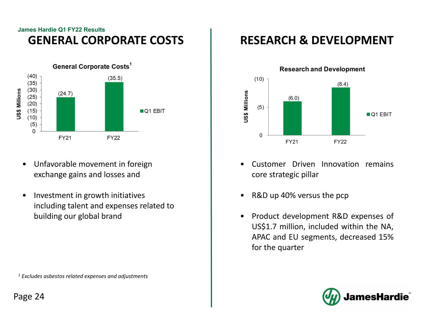Page 24 James Hardie Q1 FY22 Results GENERAL CORPORATE COSTS • Unfavorable movement in foreign exchange gains and losses and • Investment in growth initiatives including talent and expenses related to building our global brand • Customer Driven Innovation remains core strategic pillar • R&D up 40% versus the pcp • Product development R&D expenses of US$1.7 million, included within the NA, APAC and EU segments, decreased 15% for the quarter RESEARCH & DEVELOPMENT (6.0) (8.4) (10) (5) 0 FY21 FY22 US $ M ill io ns Research and Development Q1 EBIT 1 Excludes asbestos related expenses and adjustments