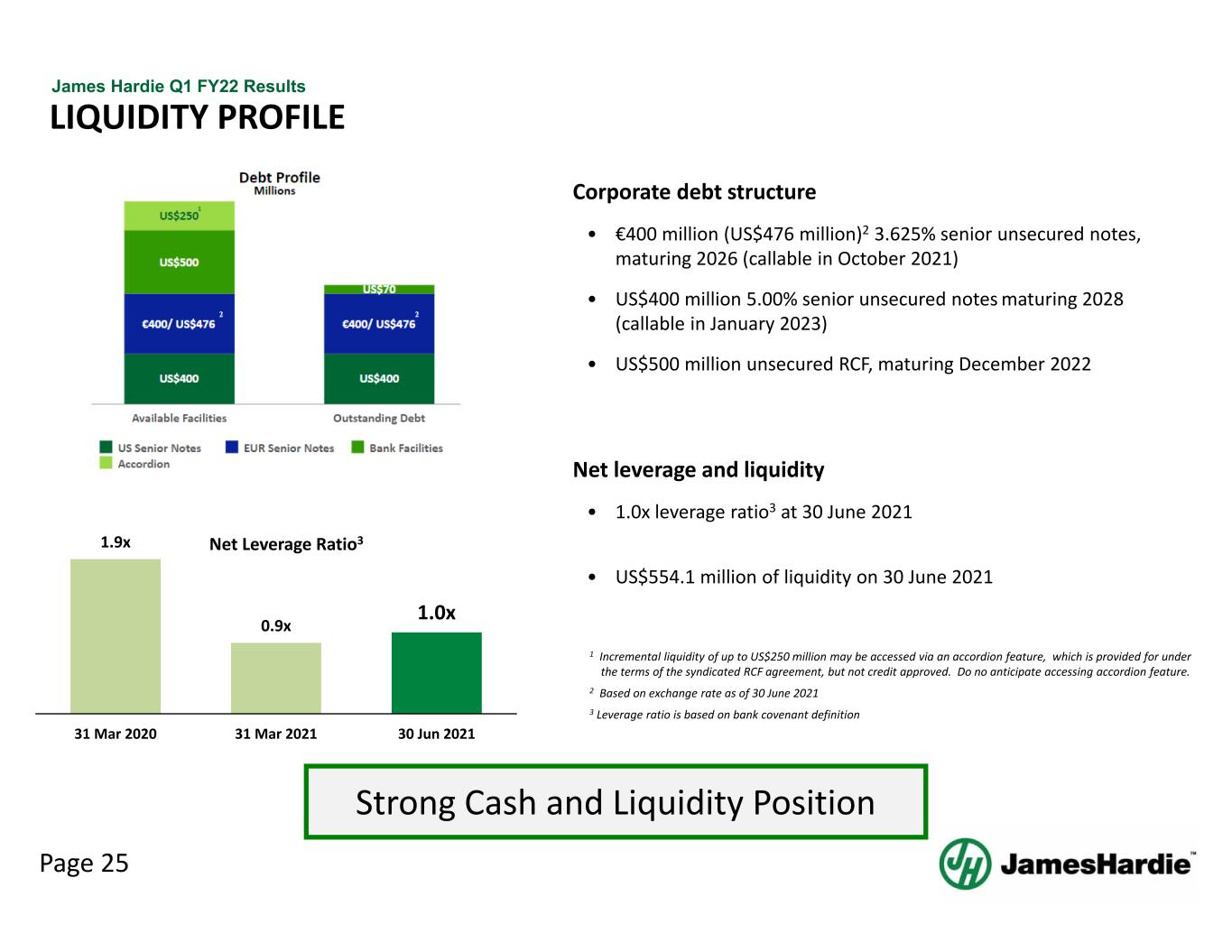 Page 25 James Hardie Q1 FY22 Results LIQUIDITY PROFILE Strong Cash and Liquidity Position 2 1 Incremental liquidity of up to US$250 million may be accessed via an accordion feature, which is provided for under the terms of the syndicated RCF agreement, but not credit approved. Do no anticipate accessing accordion feature. 2 Based on exchange rate as of 30 June 2021 3 Leverage ratio is based on bank covenant definition 1.9x 0.9x 1.0x 31 Mar 2020 31 Mar 2021 30 Jun 2021 Net Leverage Ratio3 Corporate debt structure • €400 million (US$476 million)2 3.625% senior unsecured notes, maturing 2026 (callable in October 2021) • US$400 million 5.00% senior unsecured notesmaturing 2028 (callable in January 2023) • US$500 million unsecured RCF, maturing December 2022 Net leverage and liquidity • 1.0x leverage ratio3 at 30 June 2021 • US$554.1 million of liquidity on 30 June 2021