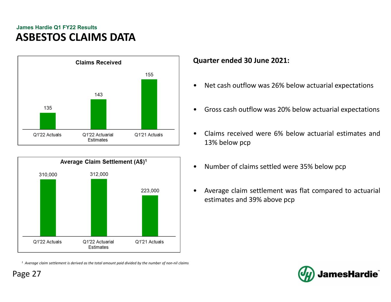 Page 27 James Hardie Q1 FY22 Results Quarter ended 30 June 2021: • Net cash outflow was 26% below actuarial expectations • Gross cash outflow was 20% below actuarial expectations • Claims received were 6% below actuarial estimates and 13% below pcp • Number of claims settled were 35% below pcp • Average claim settlement was flat compared to actuarial estimates and 39% above pcp ASBESTOS CLAIMS DATA 1 Average claim settlement is derived as the total amount paid divided by the number of non‐nil claims