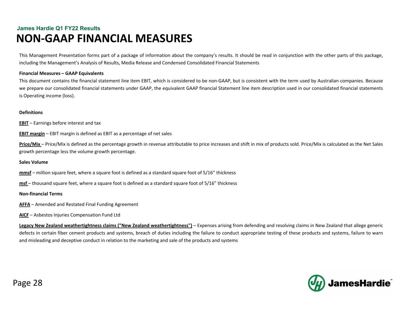 Page 28 James Hardie Q1 FY22 Results This Management Presentation forms part of a package of information about the company’s results. It should be read in conjunction with the other parts of this package, including the Management’s Analysis of Results, Media Release and Condensed Consolidated Financial Statements Financial Measures – GAAP Equivalents This document contains the financial statement line item EBIT, which is considered to be non‐GAAP, but is consistent with the term used by Australian companies. Because we prepare our consolidated financial statements under GAAP, the equivalent GAAP financial Statement line item description used in our consolidated financial statements is Operating income (loss). Definitions EBIT – Earnings before interest and tax EBIT margin – EBIT margin is defined as EBIT as a percentage of net sales Price/Mix – Price/Mix is defined as the percentage growth in revenue attributable to price increases and shift in mix of products sold. Price/Mix is calculated as the Net Sales growth percentage less the volume growth percentage. Sales Volume mmsf –million square feet, where a square foot is defined as a standard square foot of 5/16” thickness msf – thousand square feet, where a square foot is defined as a standard square foot of 5/16” thickness Non‐financial Terms AFFA – Amended and Restated Final Funding Agreement AICF – Asbestos Injuries Compensation Fund Ltd Legacy New Zealand weathertightness claims ("New Zealand weathertightness") – Expenses arising from defending and resolving claims in New Zealand that allege generic defects in certain fiber cement products and systems, breach of duties including the failure to conduct appropriate testing of these products and systems, failure to warn and misleading and deceptive conduct in relation to the marketing and sale of the products and systems NON‐GAAP FINANCIAL MEASURES