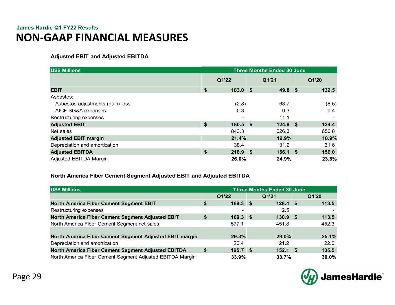 Page 29 James Hardie Q1 FY22 Results NON‐GAAP FINANCIAL MEASURES Adjusted EBIT and Adjusted EBITDA US$ Millions Q1'22 Q1'21 Q1'20 EBIT 183.0$ 49.8$ 132.5$ Asbestos: Asbestos adjustments (gain) loss (2.8) 63.7 (8.5) AICF SG&A expenses 0.3 0.3 0.4 Restructuring expenses - 11.1 - Adjusted EBIT 180.5$ 124.9$ 124.4$ Net sales 843.3 626.3 656.8 Adjusted EBIT margin 21.4% 19.9% 18.9% Depreciation and amortization 38.4 31.2 31.6 Adjusted EBITDA 218.9$ 156.1$ 156.0$ Adjusted EBITDA Margin 26.0% 24.9% 23.8% Three Months Ended 30 June US$ Millions Q1'22 Q1'21 Q1'20 North America Fiber Cement Segment EBIT 169.3$ 128.4$ 113.5$ Restructuring expenses - 2.5 - North America Fiber Cement Segment Adjusted EBIT 169.3$ 130.9$ 113.5$ North America Fiber Cement Segment net sales 577.1 451.8 452.3 North America Fiber Cement Segment Adjusted EBIT margin 29.3% 29.0% 25.1% Depreciation and amortization 26.4 21.2 22.0 North America Fiber Cement Segment Adjusted EBITDA 195.7$ 152.1$ 135.5$ North America Fiber Cement Segment Adjusted EBITDA Margin 33.9% 33.7% 30.0% Three Months Ended 30 June North America Fiber Cement Segment Adjusted EBIT and Adjusted EBITDA
