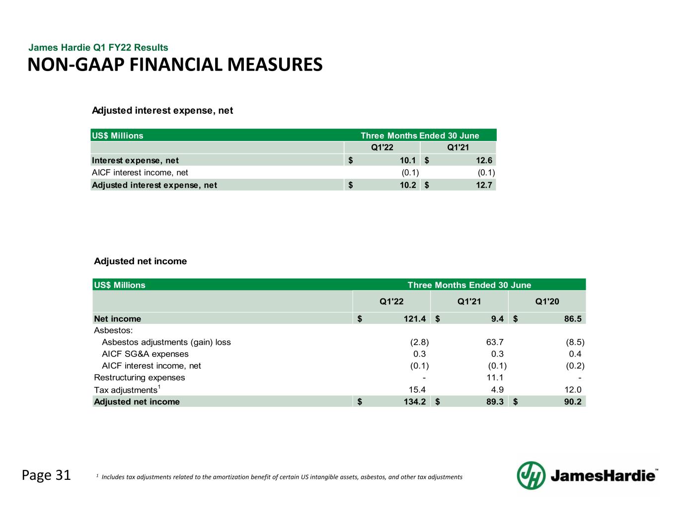 Page 30 James Hardie Q1 FY22 Results NON‐GAAP FINANCIAL MEASURES US$ Millions Q1'22 Q1'21 Q1'20 Asia Pacific Fiber Cement Segment EBIT 38.8$ 18.9$ 24.8$ Restructuring expenses - 3.4 - Asia Pacific Fiber Cement Segment Adjusted EBIT 38.8$ 22.3$ 24.8$ Asia Pacific Fiber Cement Segment net sales 141.8 91.3 108.0 Asia Pacific Fiber Cement Segment Adjusted EBIT margin 27.4% 24.4% 23.0% Depreciation and amortization 3.6 2.8 3.0 Asia Pacific Fiber Cement Segment Adjusted EBITDA 42.4$ 25.1$ 27.8$ Asia Pacific Fiber Cement Segment Adjusted EBITDA Margin 29.9% 27.3% 25.7% Three Months Ended 30 June Asia Pacific Fiber Cement Segment Adjusted EBIT and Adjusted EBITDA US$ Millions Q1'22 Q1'21 Q1'20 Europe Building Products Segment EBIT 16.3$ (2.7)$ 7.9$ Restructuring expenses - 5.1 - Europe Building Products Segment Adjusted EBIT 16.3$ 2.4$ 7.9$ Europe Building Products Segment net sales 124.4 83.2 95.9 Europe Building Products Segment Adjusted EBIT margin 13.1% 2.9% 8.2% Depreciation and amortization 7.6 6.1 5.4 Europe Building Products Segment Adjusted EBITDA 23.9$ 8.5$ 13.3$ Europe Building Products Segment Adjusted EBITDA Margin 19.2% 10.1% 13.9% Europe Building Products Segment Adjusted EBIT and Adjusted EBITDA Three Months Ended 30 June