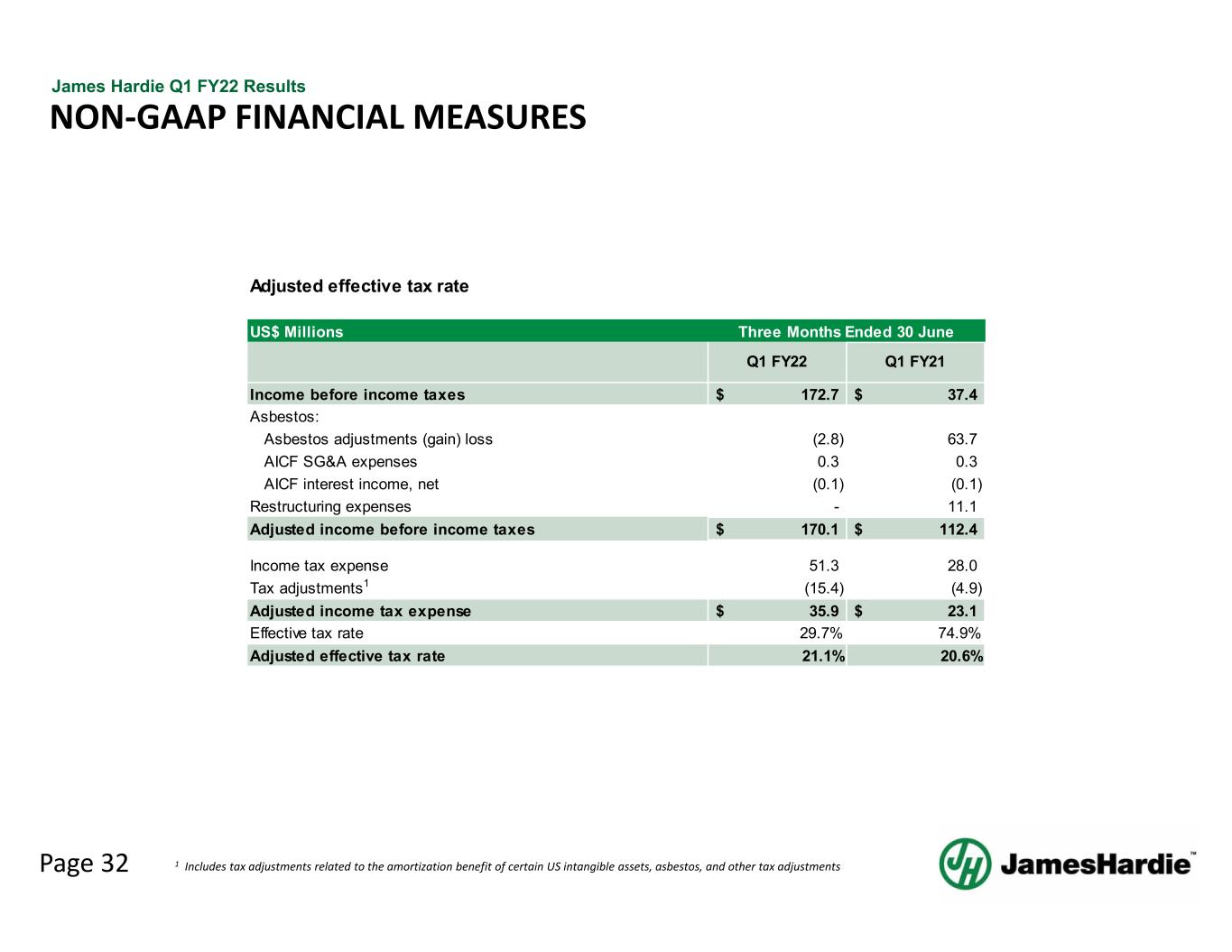 Page 31 James Hardie Q1 FY22 Results NON‐GAAP FINANCIAL MEASURES 1 Includes tax adjustments related to the amortization benefit of certain US intangible assets, asbestos, and other tax adjustments US$ Millions Q1'22 Q1'21 Interest expense, net 10.1$ 12.6$ AICF interest income, net (0.1) (0.1) Adjusted interest expense, net 10.2$ 12.7$ Adjusted interest expense, net Three Months Ended 30 June Adjusted net income US$ Millions Q1'22 Q1'21 Q1'20 Net income 121.4$ 9.4$ 86.5$ Asbestos: Asbestos adjustments (gain) loss (2.8) 63.7 (8.5) AICF SG&A expenses 0.3 0.3 0.4 AICF interest income, net (0.1) (0.1) (0.2) Restructuring expenses - 11.1 - Tax adjustments1 15.4 4.9 12.0 Adjusted net income 134.2$ 89.3$ 90.2$ Three Months Ended 30 June