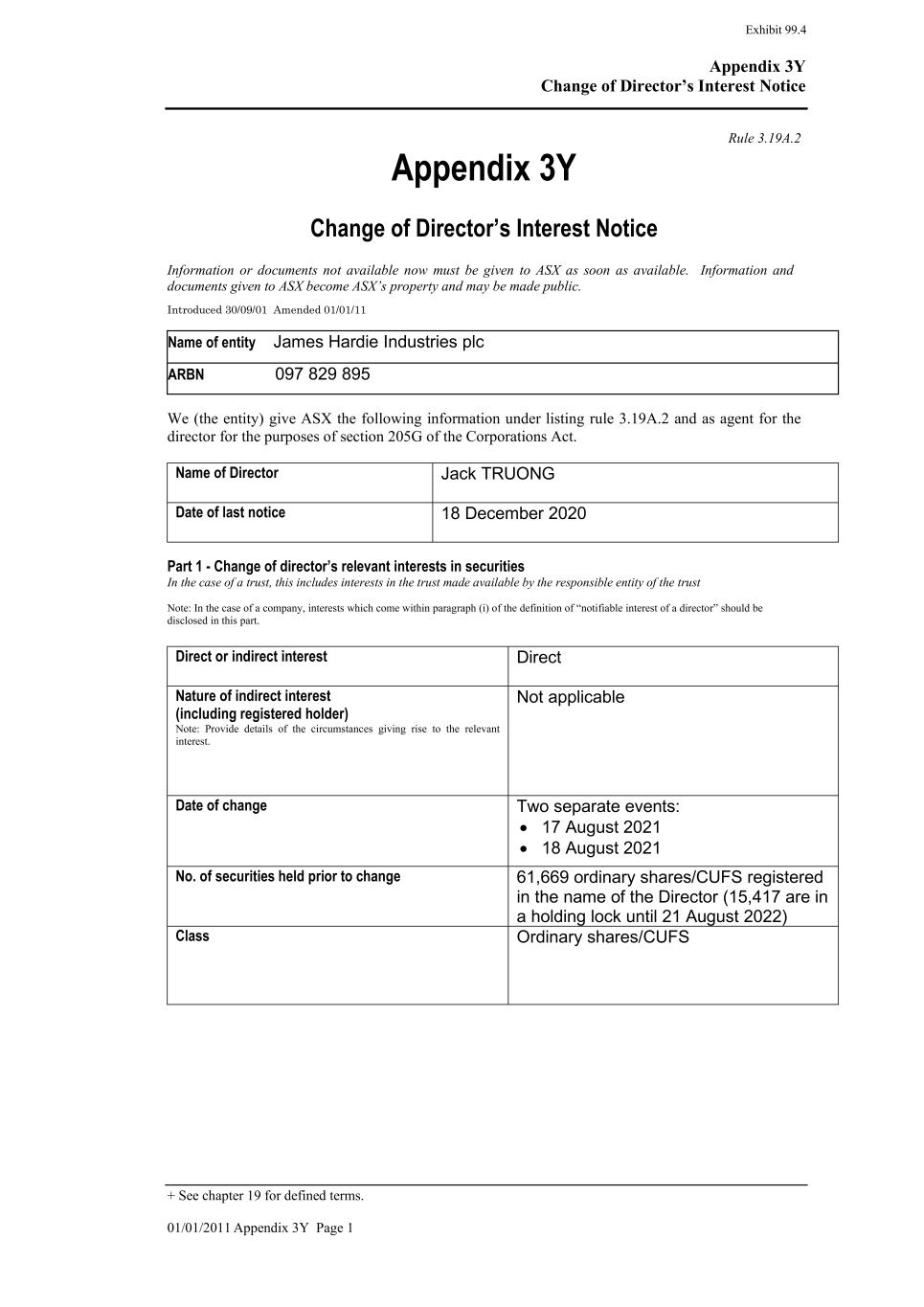 Appendix 3Y Change of Director’s Interest Notice + See chapter 19 for defined terms. 01/01/2011 Appendix 3Y Page 1 Rule 3.19A.2 Appendix 3Y Change of Director’s Interest Notice Information or documents not available now must be given to ASX as soon as available. Information and documents given to ASX become ASX’s property and may be made public. Introduced 30/09/01 Amended 01/01/11 Name of entity James Hardie Industries plc ARBN 097 829 895 We (the entity) give ASX the following information under listing rule 3.19A.2 and as agent for the director for the purposes of section 205G of the Corporations Act. Name of Director Jack TRUONG Date of last notice 18 December 2020 Part 1 - Change of director’s relevant interests in securities In the case of a trust, this includes interests in the trust made available by the responsible entity of the trust Note: In the case of a company, interests which come within paragraph (i) of the definition of “notifiable interest of a director” should be disclosed in this part. Direct or indirect interest Direct Nature of indirect interest (including registered holder) Note: Provide details of the circumstances giving rise to the relevant interest. Not applicable Date of change Two separate events: • 17 August 2021 • 18 August 2021 No. of securities held prior to change 61,669 ordinary shares/CUFS registered in the name of the Director (15,417 are in a holding lock until 21 August 2022) Class Ordinary shares/CUFS Exhibit 99.4