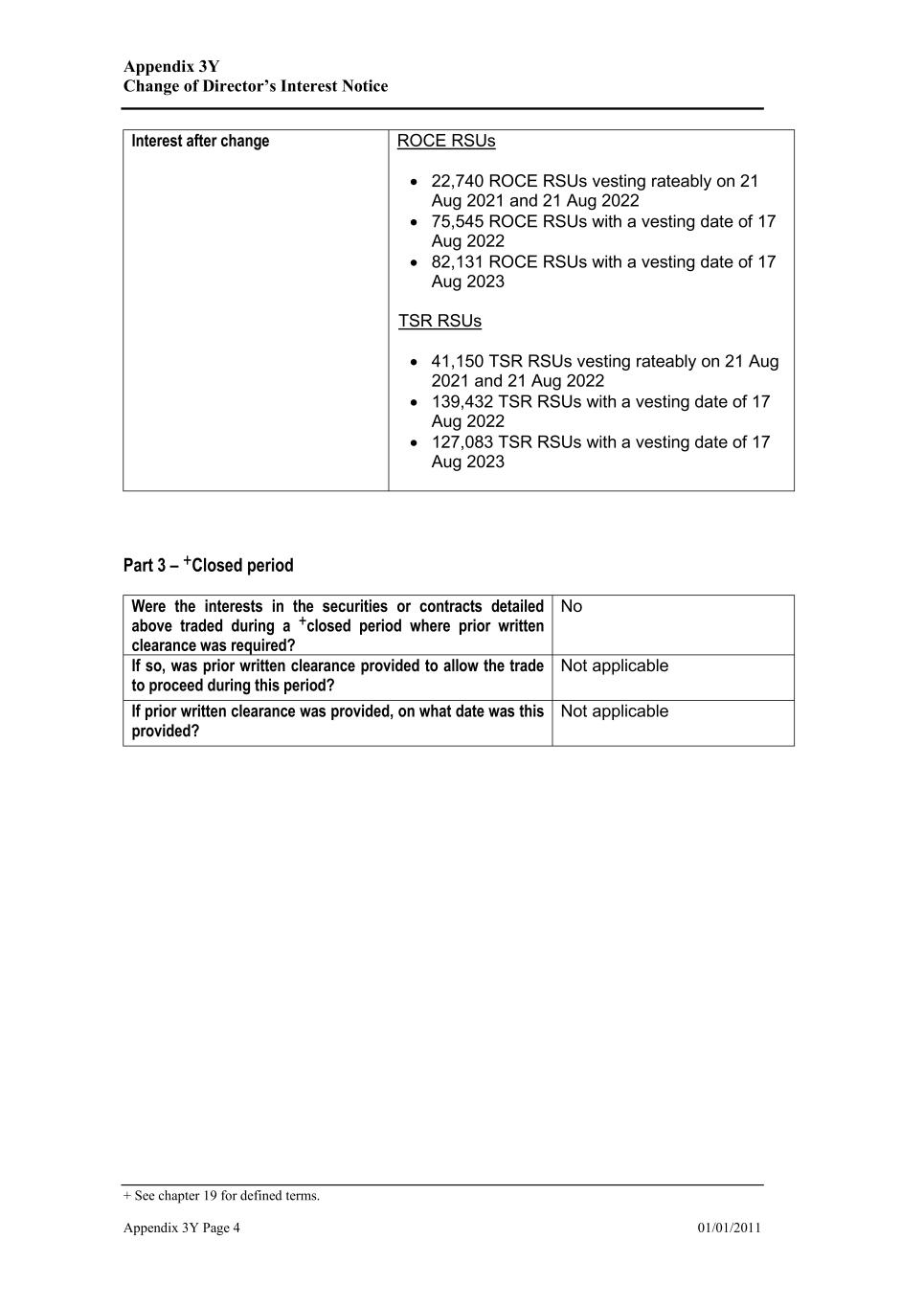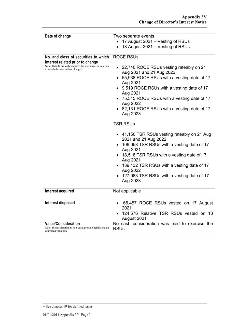 Appendix 3Y Change of Director’s Interest Notice + See chapter 19 for defined terms. 01/01/2011 Appendix 3Y Page 3 Date of change Two separate events • 17 August 2021 – Vesting of RSUs • 18 August 2021 – Vesting of RSUs No. and class of securities to which interest related prior to change Note: Details are only required for a contract in relation to which the interest has changed ROCE RSUs • 22,740 ROCE RSUs vesting rateably on 21 Aug 2021 and 21 Aug 2022 • 55,938 ROCE RSUs with a vesting date of 17 Aug 2021 • 9,519 ROCE RSUs with a vesting date of 17 Aug 2021 • 75,545 ROCE RSUs with a vesting date of 17 Aug 2022 • 82,131 ROCE RSUs with a vesting date of 17 Aug 2023 TSR RSUs • 41,150 TSR RSUs vesting rateably on 21 Aug 2021 and 21 Aug 2022 • 106,058 TSR RSUs with a vesting date of 17 Aug 2021 • 18,518 TSR RSUs with a vesting date of 17 Aug 2021 • 139,432 TSR RSUs with a vesting date of 17 Aug 2022 • 127,083 TSR RSUs with a vesting date of 17 Aug 2023 Interest acquired Not applicable Interest disposed • 65,457 ROCE RSUs vested on 17 August 2021 • 124,576 Relative TSR RSUs vested on 18 August 2021 Value/Consideration Note: If consideration is non-cash, provide details and an estimated valuation No cash consideration was paid to exercise the RSUs.