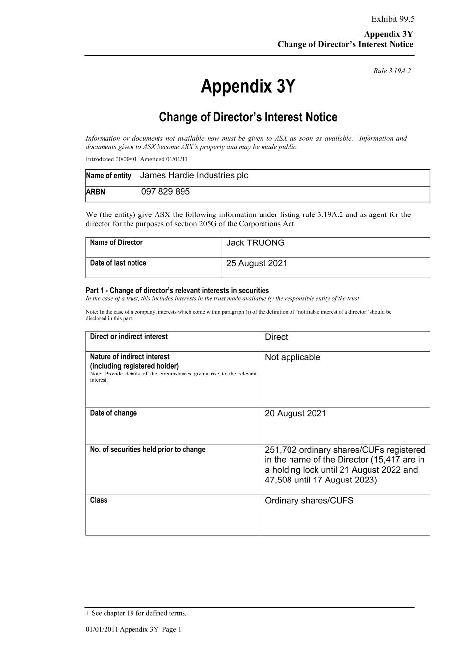 Appendix 3Y Change of Director’s Interest Notice + See chapter 19 for defined terms. 01/01/2011 Appendix 3Y Page 1 Rule 3.19A.2 Appendix 3Y Change of Director’s Interest Notice Information or documents not available now must be given to ASX as soon as available. Information and documents given to ASX become ASX’s property and may be made public. Introduced 30/09/01 Amended 01/01/11 Name of entity James Hardie Industries plc ARBN 097 829 895 We (the entity) give ASX the following information under listing rule 3.19A.2 and as agent for the director for the purposes of section 205G of the Corporations Act. Name of Director Jack TRUONG Date of last notice 25 August 2021 Part 1 - Change of director’s relevant interests in securities In the case of a trust, this includes interests in the trust made available by the responsible entity of the trust Note: In the case of a company, interests which come within paragraph (i) of the definition of “notifiable interest of a director” should be disclosed in this part. Direct or indirect interest Direct Nature of indirect interest (including registered holder) Note: Provide details of the circumstances giving rise to the relevant interest. Not applicable Date of change 20 August 2021 No. of securities held prior to change 251,702 ordinary shares/CUFs registered in the name of the Director (15,417 are in a holding lock until 21 August 2022 and 47,508 until 17 August 2023) Class Ordinary shares/CUFS Exhibit 99.5