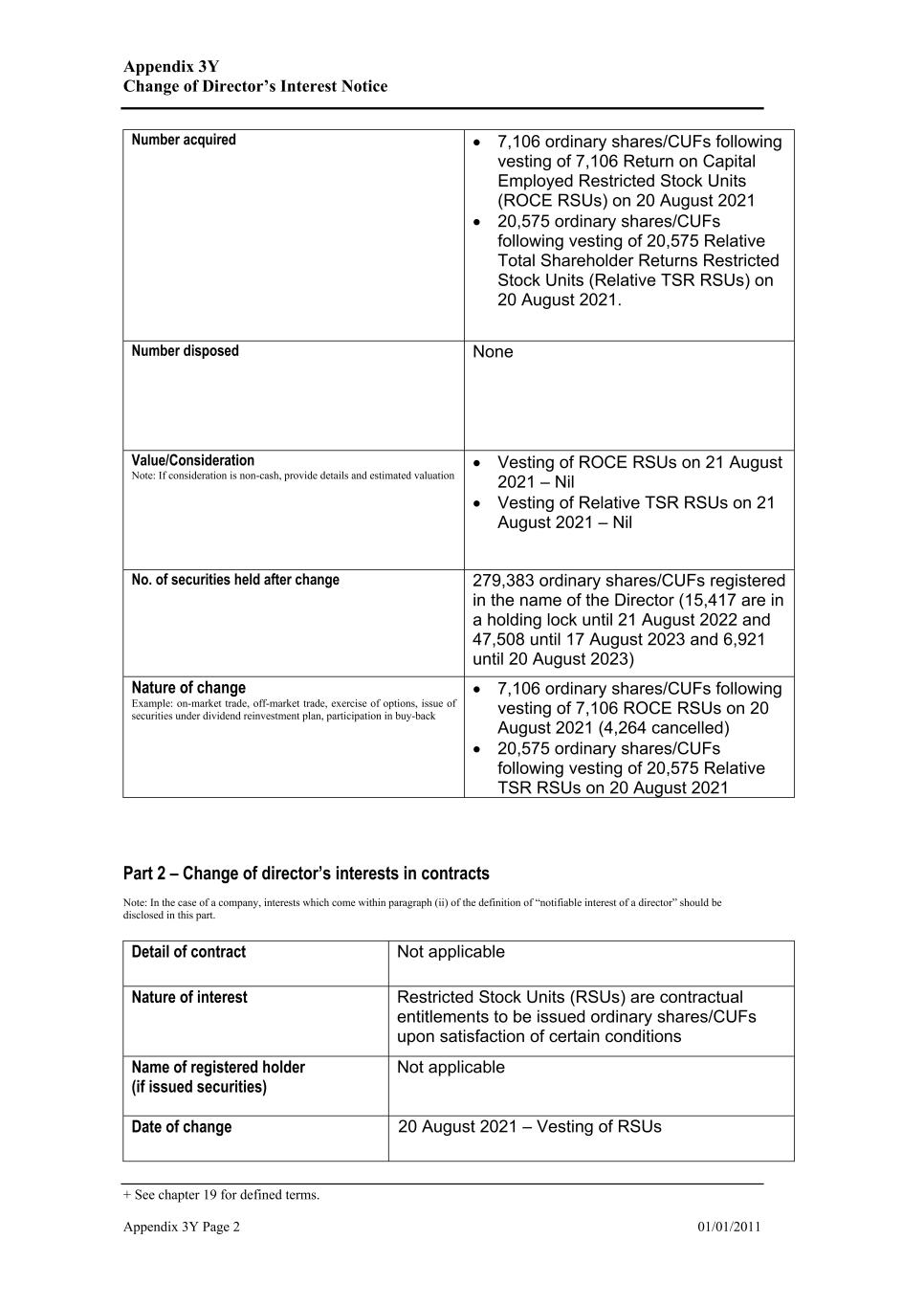 Appendix 3Y Change of Director’s Interest Notice + See chapter 19 for defined terms. Appendix 3Y Page 2 01/01/2011 Number acquired • 7,106 ordinary shares/CUFs following vesting of 7,106 Return on Capital Employed Restricted Stock Units (ROCE RSUs) on 20 August 2021 • 20,575 ordinary shares/CUFs following vesting of 20,575 Relative Total Shareholder Returns Restricted Stock Units (Relative TSR RSUs) on 20 August 2021. Number disposed None Value/Consideration Note: If consideration is non-cash, provide details and estimated valuation • Vesting of ROCE RSUs on 21 August 2021 – Nil • Vesting of Relative TSR RSUs on 21 August 2021 – Nil No. of securities held after change 279,383 ordinary shares/CUFs registered in the name of the Director (15,417 are in a holding lock until 21 August 2022 and 47,508 until 17 August 2023 and 6,921 until 20 August 2023) Nature of change Example: on-market trade, off-market trade, exercise of options, issue of securities under dividend reinvestment plan, participation in buy-back • 7,106 ordinary shares/CUFs following vesting of 7,106 ROCE RSUs on 20 August 2021 (4,264 cancelled) • 20,575 ordinary shares/CUFs following vesting of 20,575 Relative TSR RSUs on 20 August 2021 Part 2 – Change of director’s interests in contracts Note: In the case of a company, interests which come within paragraph (ii) of the definition of “notifiable interest of a director” should be disclosed in this part. Detail of contract Not applicable Nature of interest Restricted Stock Units (RSUs) are contractual entitlements to be issued ordinary shares/CUFs upon satisfaction of certain conditions Name of registered holder (if issued securities) Not applicable Date of change 20 August 2021 – Vesting of RSUs