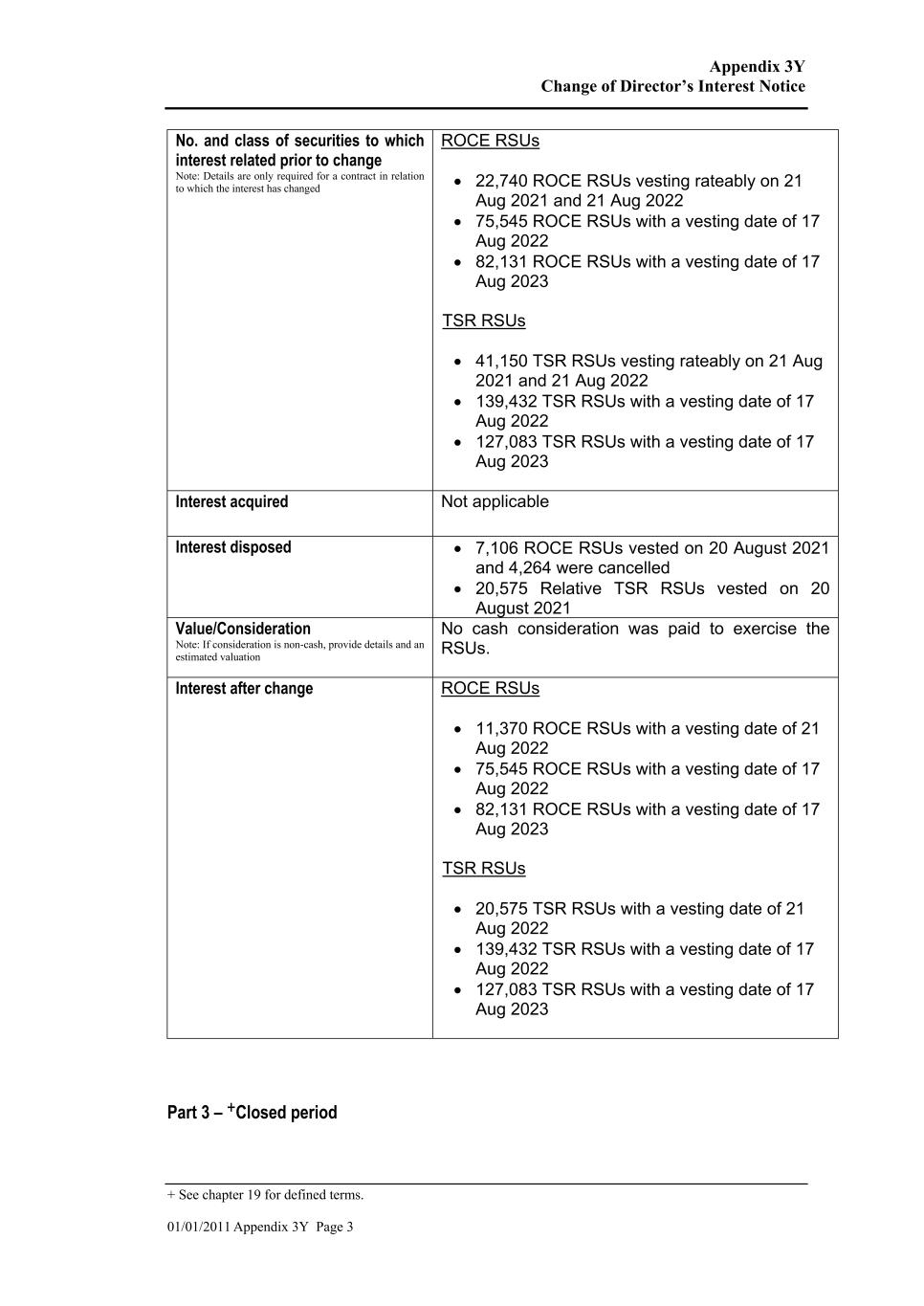 Appendix 3Y Change of Director’s Interest Notice + See chapter 19 for defined terms. 01/01/2011 Appendix 3Y Page 3 No. and class of securities to which interest related prior to change Note: Details are only required for a contract in relation to which the interest has changed ROCE RSUs • 22,740 ROCE RSUs vesting rateably on 21 Aug 2021 and 21 Aug 2022 • 75,545 ROCE RSUs with a vesting date of 17 Aug 2022 • 82,131 ROCE RSUs with a vesting date of 17 Aug 2023 TSR RSUs • 41,150 TSR RSUs vesting rateably on 21 Aug 2021 and 21 Aug 2022 • 139,432 TSR RSUs with a vesting date of 17 Aug 2022 • 127,083 TSR RSUs with a vesting date of 17 Aug 2023 Interest acquired Not applicable Interest disposed • 7,106 ROCE RSUs vested on 20 August 2021 and 4,264 were cancelled • 20,575 Relative TSR RSUs vested on 20 August 2021 Value/Consideration Note: If consideration is non-cash, provide details and an estimated valuation No cash consideration was paid to exercise the RSUs. Interest after change ROCE RSUs • 11,370 ROCE RSUs with a vesting date of 21 Aug 2022 • 75,545 ROCE RSUs with a vesting date of 17 Aug 2022 • 82,131 ROCE RSUs with a vesting date of 17 Aug 2023 TSR RSUs • 20,575 TSR RSUs with a vesting date of 21 Aug 2022 • 139,432 TSR RSUs with a vesting date of 17 Aug 2022 • 127,083 TSR RSUs with a vesting date of 17 Aug 2023 Part 3 – +Closed period