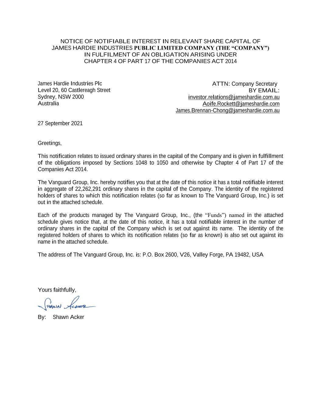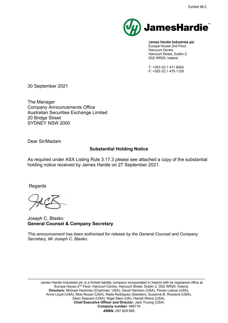 James Hardie Industries plc Europa House 2nd Floor, Harcourt Centre Harcourt Street, Dublin 2, D02 WR20, Ireland T: +353 (0) 1 411 6924 F: +353 (0) 1 479 1128 James Hardie Industries plc is a limited liability company incorporated in Ireland with its registered office at Europa House 2nd Floor, Harcourt Centre, Harcourt Street, Dublin 2, D02 WR20, Ireland. Directors: Michael Hammes (Chairman, USA), David Harrison (USA), Persio Lisboa (USA), Anne Lloyd (USA), Moe Nozari (USA), Rada Rodriguez (Sweden), Suzanne B. Rowland (USA), Dean Seavers (USA), Nigel Stein (UK), Harold Wiens (USA). Chief Executive Officer and Director: Jack Truong (USA) Company number: 485719 ARBN: 097 829 895 30 September 2021 The Manager Company Announcements Office Australian Securities Exchange Limited 20 Bridge Street SYDNEY NSW 2000 Dear Sir/Madam Substantial Holding Notice As required under ASX Listing Rule 3.17.3 please see attached a copy of the substantial holding notice received by James Hardie on 27 September 2021. Regards Joseph C. Blasko General Counsel & Company Secretary This announcement has been authorised for release by the General Counsel and Company Secretary, Mr Joseph C. Blasko. Exhibit 99.2