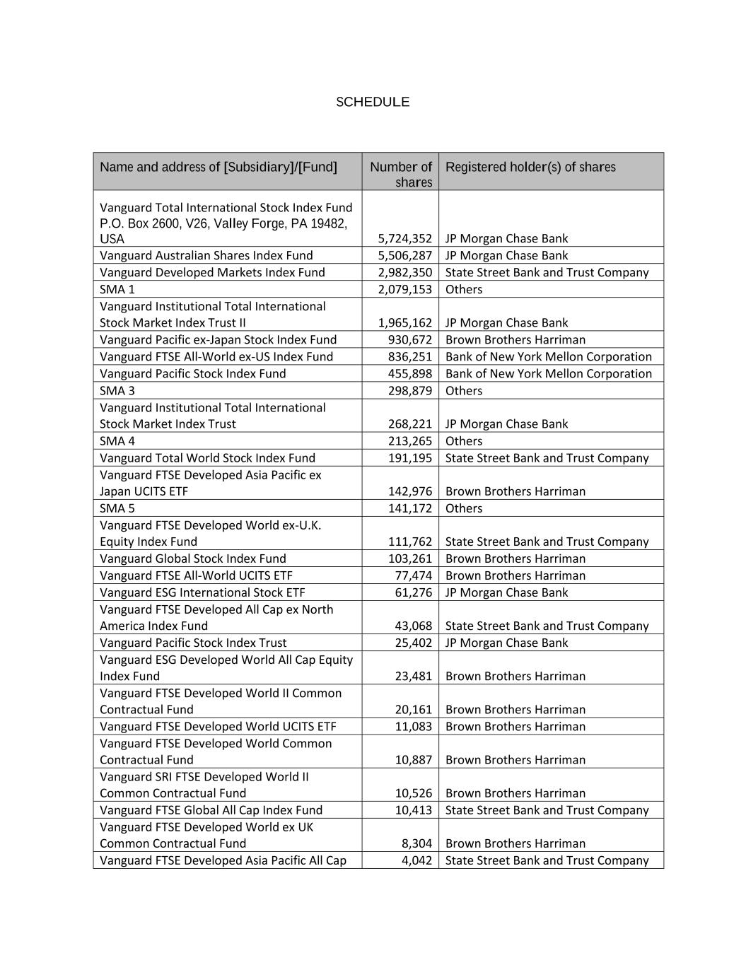 SCHEDULE Name and address of [Subsidiary]/[Fund] Number of shares Registered holder(s) of shares Vanguard Total International Stock Index Fund P.O. Box 2600, V26, Valley Forge, PA 19482, USA 5,724,352 JP Morgan Chase Bank Vanguard Australian Shares Index Fund 5,506,287 JP Morgan Chase Bank Vanguard Developed Markets Index Fund 2,982,350 State Street Bank and Trust Company SMA 1 2,079,153 Others Vanguard Institutional Total International Stock Market Index Trust II 1,965,162 JP Morgan Chase Bank Vanguard Pacific ex-Japan Stock Index Fund 930,672 Brown Brothers Harriman Vanguard FTSE All-World ex-US Index Fund 836,251 Bank of New York Mellon Corporation Vanguard Pacific Stock Index Fund 455,898 Bank of New York Mellon Corporation SMA 3 298,879 Others Vanguard Institutional Total International Stock Market Index Trust 268,221 JP Morgan Chase Bank SMA 4 213,265 Others Vanguard Total World Stock Index Fund 191,195 State Street Bank and Trust Company Vanguard FTSE Developed Asia Pacific ex Japan UCITS ETF 142,976 Brown Brothers Harriman SMA 5 141,172 Others Vanguard FTSE Developed World ex-U.K. Equity Index Fund 111,762 State Street Bank and Trust Company Vanguard Global Stock Index Fund 103,261 Brown Brothers Harriman Vanguard FTSE All-World UCITS ETF 77,474 Brown Brothers Harriman Vanguard ESG International Stock ETF 61,276 JP Morgan Chase Bank Vanguard FTSE Developed All Cap ex North America Index Fund 43,068 State Street Bank and Trust Company Vanguard Pacific Stock Index Trust 25,402 JP Morgan Chase Bank Vanguard ESG Developed World All Cap Equity Index Fund 23,481 Brown Brothers Harriman Vanguard FTSE Developed World II Common Contractual Fund 20,161 Brown Brothers Harriman Vanguard FTSE Developed World UCITS ETF 11,083 Brown Brothers Harriman Vanguard FTSE Developed World Common Contractual Fund 10,887 Brown Brothers Harriman Vanguard SRI FTSE Developed World II Common Contractual Fund 10,526 Brown Brothers Harriman Vanguard FTSE Global All Cap Index Fund 10,413 State Street Bank and Trust Company Vanguard FTSE Developed World ex UK Common Contractual Fund 8,304 Brown Brothers Harriman Vanguard FTSE Developed Asia Pacific All Cap 4,042 State Street Bank and Trust Company