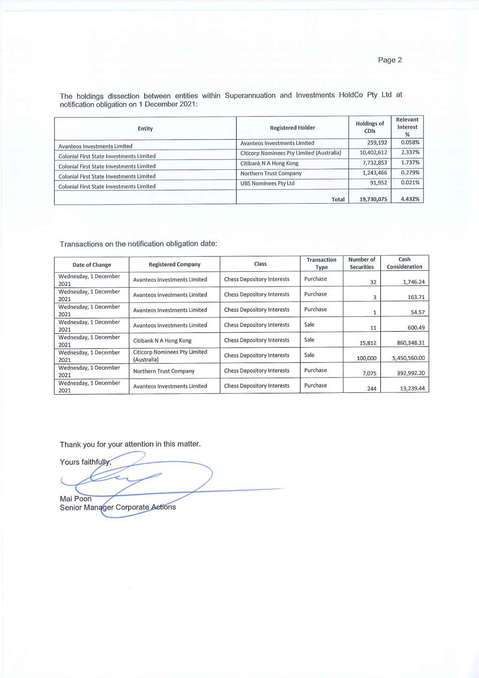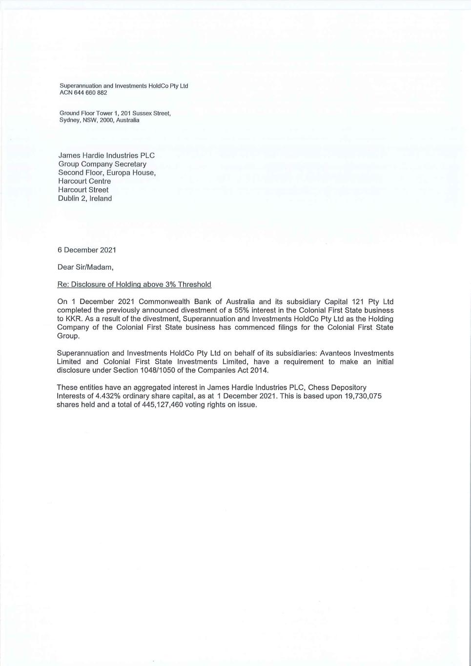 Exhibit 99.1 James Hardie Industries plc Europa House 2nd Floor, Harcourt Centre Harcourt Street, Dublin 2, D02 WR20, Ireland T: +353 (0) 1 411 6924 F: +353 (0) 1 479 1128 James Hardie Industries plc is a limited liability company incorporated in Ireland with its registered office at Europa House 2nd Floor, Harcourt Centre, Harcourt Street, Dublin 2, D02 WR20, Ireland. Directors: Michael Hammes (Chairman, USA), Persio Lisboa (USA), Anne Lloyd (USA), Moe Nozari (USA), Rada Rodriguez (Sweden), Suzanne B. Rowland (USA), Dean Seavers (USA), Nigel Stein (UK), Harold Wiens (USA). Chief Executive Officer and Director: Jack Truong (USA) Company number: 485719 ARBN: 097 829 895 7 December 2021 The Manager Company Announcements Office Australian Securities Exchange Limited 20 Bridge Street SYDNEY NSW 2000 Dear Sir/Madam Substantial Holding Notice As required under ASX Listing Rule 3.17.3 please see attached a copy of the substantial holding notice received by James Hardie on 6 December 2021. Regards Joseph C. Blasko General Counsel & Company Secretary This announcement has been authorised for release by the General Counsel and Company Secretary, Mr Joseph C. Blasko.