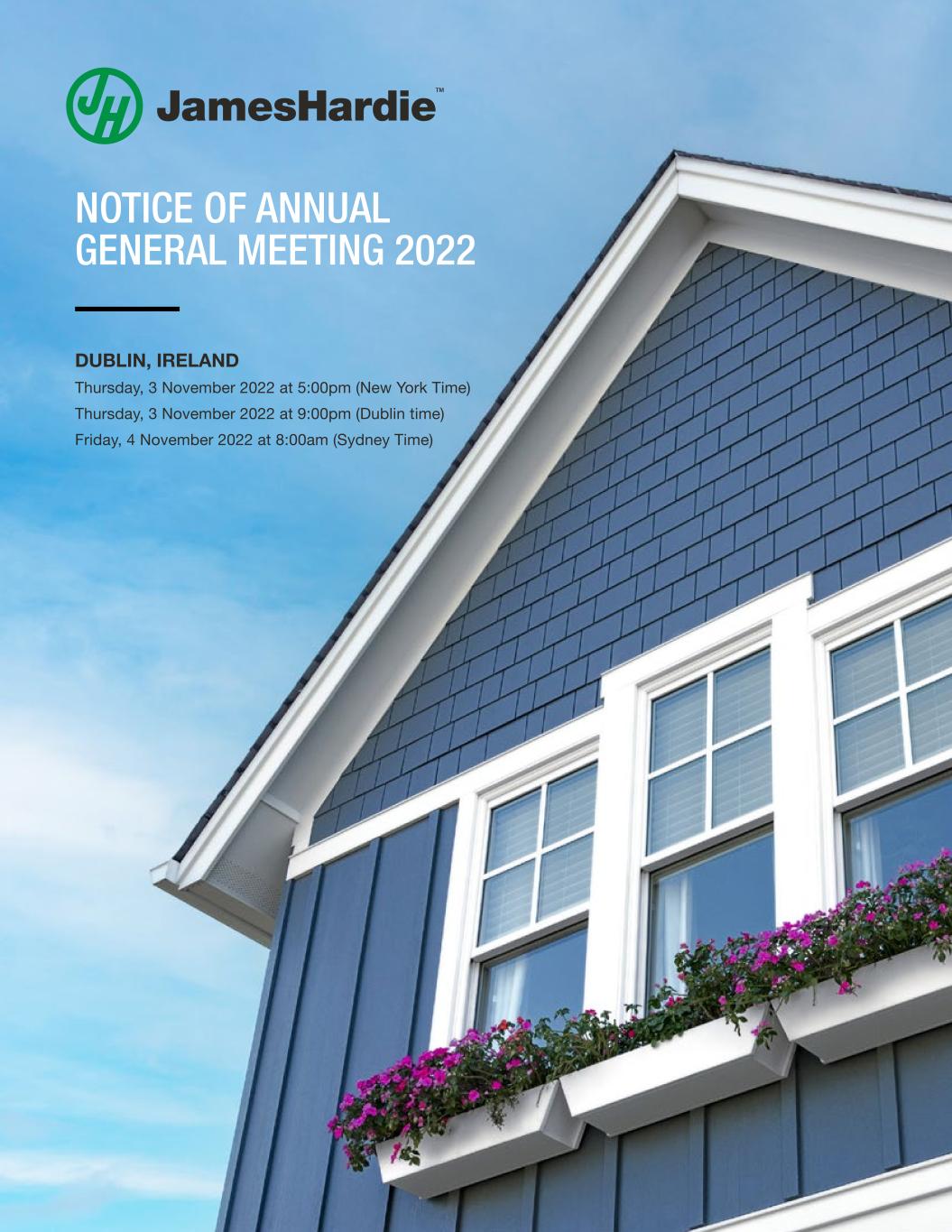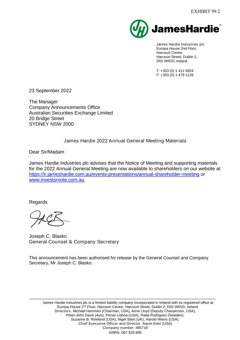 James Hardie Industries plc Europa House 2nd Floor, Harcourt Centre Harcourt Street, Dublin 2, D02 WR20, Ireland T: +353 (0) 1 411 6924 F: +353 (0) 1 479 1128 James Hardie Industries plc is a limited liability company incorporated in Ireland with its registered office at Europa House 2nd Floor, Harcourt Centre, Harcourt Street, Dublin 2, D02 WR20, Ireland. Directors: Michael Hammes (Chairman, USA), Anne Lloyd (Deputy Chairperson, USA), Peter-John Davis (Aus), Persio Lisboa (USA), Rada Rodriguez (Sweden), Suzanne B. Rowland (USA), Nigel Stein (UK), Harold Wiens (USA). Chief Executive Officer and Director: Aaron Erter (USA) Company number: 485719 ARBN: 097 829 895 23 September 2022 The Manager Company Announcements Office Australian Securities Exchange Limited 20 Bridge Street SYDNEY NSW 2000 James Hardie 2022 Annual General Meeting Materials Dear Sir/Madam James Hardie Industries plc advises that the Notice of Meeting and supporting materials for the 2022 Annual General Meeting are now available to shareholders on our website at https://ir.jameshardie.com.au/events-presentations/annual-shareholder-meeting or www.investorvote.com.au. Regards Joseph C. Blasko General Counsel & Company Secretary This announcement has been authorised for release by the General Counsel and Company Secretary, Mr Joseph C. Blasko.