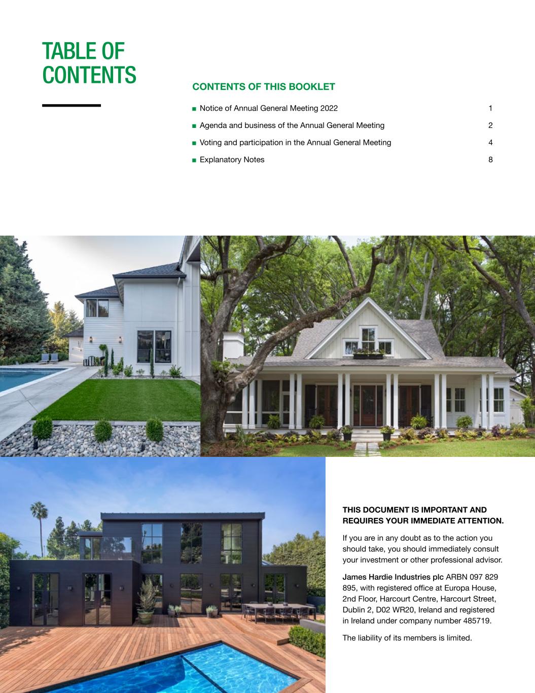 TABLE OF CONTENTS THIS DOCUMENT IS IMPORTANT AND REQUIRES YOUR IMMEDIATE ATTENTION. If you are in any doubt as to the action you should take, you should immediately consult your investment or other professional advisor. James Hardie Industries plc ARBN 097 829 895, with registered office at Europa House, 2nd Floor, Harcourt Centre, Harcourt Street, Dublin 2, D02 WR20, Ireland and registered in Ireland under company number 485719. The liability of its members is limited. CONTENTS OF THIS BOOKLET Notice of Annual General Meeting 2022 1 Agenda and business of the Annual General Meeting 2 Voting and participation in the Annual General Meeting 4 Explanatory Notes 8