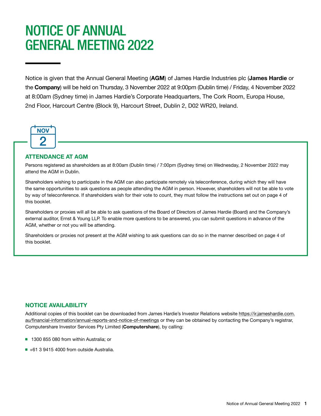 Notice of Annual General Meeting 2022 1 NOTICE OF ANNUAL GENERAL MEETING 2022 Notice is given that the Annual General Meeting (AGM) of James Hardie Industries plc (James Hardie or the Company) will be held on Thursday, 3 November 2022 at 9:00pm (Dublin time) / Friday, 4 November 2022 at 8:00am (Sydney time) in James Hardie’s Corporate Headquarters, The Cork Room, Europa House, 2nd Floor, Harcourt Centre (Block 9), Harcourt Street, Dublin 2, D02 WR20, Ireland. ATTENDANCE AT AGM Persons registered as shareholders as at 8:00am (Dublin time) / 7:00pm (Sydney time) on Wednesday, 2 November 2022 may attend the AGM in Dublin. Shareholders wishing to participate in the AGM can also participate remotely via teleconference, during which they will have the same opportunities to ask questions as people attending the AGM in person. However, shareholders will not be able to vote by way of teleconference. If shareholders wish for their vote to count, they must follow the instructions set out on page 4 of this booklet. Shareholders or proxies will all be able to ask questions of the Board of Directors of James Hardie (Board) and the Company’s external auditor, Ernst & Young LLP. To enable more questions to be answered, you can submit questions in advance of the AGM, whether or not you will be attending. Shareholders or proxies not present at the AGM wishing to ask questions can do so in the manner described on page 4 of this booklet. 2 NOV NOTICE AVAILABILITY Additional copies of this booklet can be downloaded from James Hardie’s Investor Relations website https://ir.jameshardie.com. au/financial-information/annual-reports-and-notice-of-meetings or they can be obtained by contacting the Company’s registrar, Computershare Investor Services Pty Limited (Computershare), by calling: 1300 855 080 from within Australia; or +61 3 9415 4000 from outside Australia.