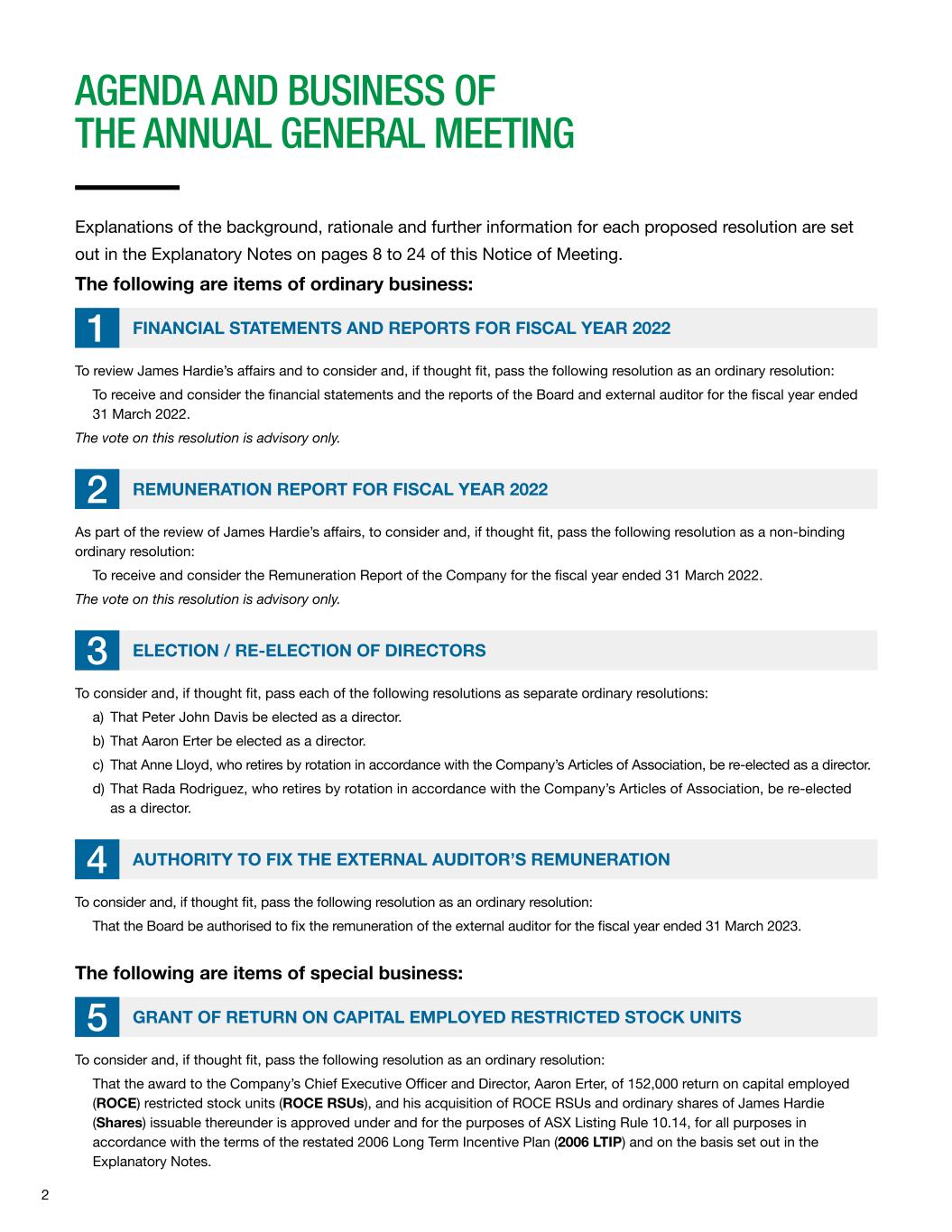 2 AGENDA AND BUSINESS OF THE ANNUAL GENERAL MEETING Explanations of the background, rationale and further information for each proposed resolution are set out in the Explanatory Notes on pages 8 to 24 of this Notice of Meeting. The following are items of ordinary business: 1 FINANCIAL STATEMENTS AND REPORTS FOR FISCAL YEAR 2022 To review James Hardie’s affairs and to consider and, if thought fit, pass the following resolution as an ordinary resolution: To receive and consider the financial statements and the reports of the Board and external auditor for the fiscal year ended 31 March 2022. The vote on this resolution is advisory only. 2 REMUNERATION REPORT FOR FISCAL YEAR 2022 As part of the review of James Hardie’s affairs, to consider and, if thought fit, pass the following resolution as a non-binding ordinary resolution: To receive and consider the Remuneration Report of the Company for the fiscal year ended 31 March 2022. The vote on this resolution is advisory only. 3 ELECTION / RE-ELECTION OF DIRECTORS To consider and, if thought fit, pass each of the following resolutions as separate ordinary resolutions: a) That Peter John Davis be elected as a director. b) That Aaron Erter be elected as a director. c) That Anne Lloyd, who retires by rotation in accordance with the Company’s Articles of Association, be re-elected as a director. d) That Rada Rodriguez, who retires by rotation in accordance with the Company’s Articles of Association, be re-elected as a director. 4 AUTHORITY TO FIX THE EXTERNAL AUDITOR’S REMUNERATION To consider and, if thought fit, pass the following resolution as an ordinary resolution: That the Board be authorised to fix the remuneration of the external auditor for the fiscal year ended 31 March 2023. The following are items of special business: 5 GRANT OF RETURN ON CAPITAL EMPLOYED RESTRICTED STOCK UNITS To consider and, if thought fit, pass the following resolution as an ordinary resolution: That the award to the Company’s Chief Executive Officer and Director, Aaron Erter, of 152,000 return on capital employed (ROCE) restricted stock units (ROCE RSUs), and his acquisition of ROCE RSUs and ordinary shares of James Hardie (Shares) issuable thereunder is approved under and for the purposes of ASX Listing Rule 10.14, for all purposes in accordance with the terms of the restated 2006 Long Term Incentive Plan (2006 LTIP) and on the basis set out in the Explanatory Notes.