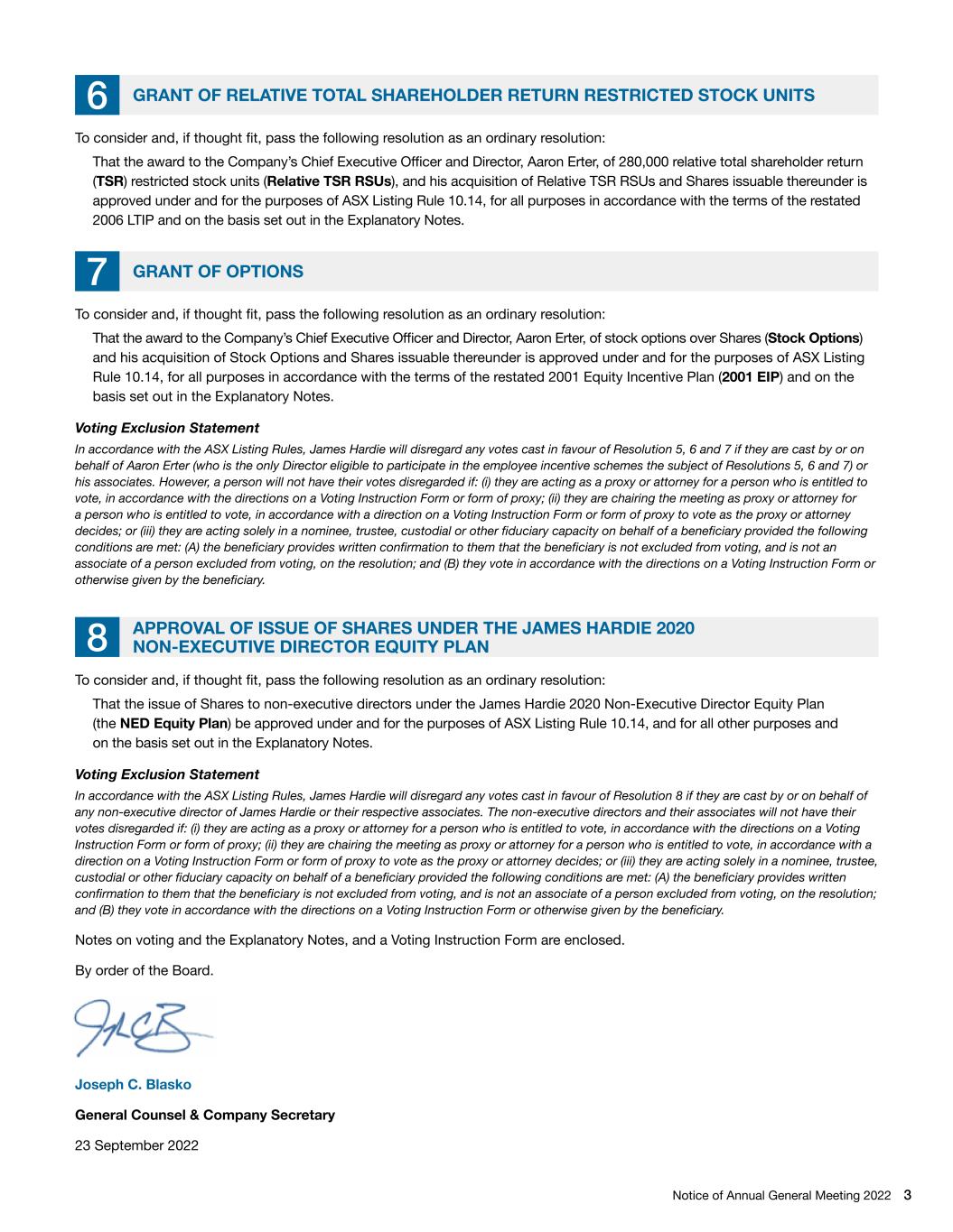 Notice of Annual General Meeting 2022 3 6 GRANT OF RELATIVE TOTAL SHAREHOLDER RETURN RESTRICTED STOCK UNITS To consider and, if thought fit, pass the following resolution as an ordinary resolution: That the award to the Company’s Chief Executive Officer and Director, Aaron Erter, of 280,000 relative total shareholder return (TSR) restricted stock units (Relative TSR RSUs), and his acquisition of Relative TSR RSUs and Shares issuable thereunder is approved under and for the purposes of ASX Listing Rule 10.14, for all purposes in accordance with the terms of the restated 2006 LTIP and on the basis set out in the Explanatory Notes. 8 APPROVAL OF ISSUE OF SHARES UNDER THE JAMES HARDIE 2020 NON-EXECUTIVE DIRECTOR EQUITY PLAN To consider and, if thought fit, pass the following resolution as an ordinary resolution: That the issue of Shares to non-executive directors under the James Hardie 2020 Non-Executive Director Equity Plan (the NED Equity Plan) be approved under and for the purposes of ASX Listing Rule 10.14, and for all other purposes and on the basis set out in the Explanatory Notes. Voting Exclusion Statement In accordance with the ASX Listing Rules, James Hardie will disregard any votes cast in favour of Resolution 8 if they are cast by or on behalf of any non-executive director of James Hardie or their respective associates. The non-executive directors and their associates will not have their votes disregarded if: (i) they are acting as a proxy or attorney for a person who is entitled to vote, in accordance with the directions on a Voting Instruction Form or form of proxy; (ii) they are chairing the meeting as proxy or attorney for a person who is entitled to vote, in accordance with a direction on a Voting Instruction Form or form of proxy to vote as the proxy or attorney decides; or (iii) they are acting solely in a nominee, trustee, custodial or other fiduciary capacity on behalf of a beneficiary provided the following conditions are met: (A) the beneficiary provides written confirmation to them that the beneficiary is not excluded from voting, and is not an associate of a person excluded from voting, on the resolution; and (B) they vote in accordance with the directions on a Voting Instruction Form or otherwise given by the beneficiary. Notes on voting and the Explanatory Notes, and a Voting Instruction Form are enclosed. By order of the Board. 7 GRANT OF OPTIONS To consider and, if thought fit, pass the following resolution as an ordinary resolution: That the award to the Company’s Chief Executive Officer and Director, Aaron Erter, of stock options over Shares (Stock Options) and his acquisition of Stock Options and Shares issuable thereunder is approved under and for the purposes of ASX Listing Rule 10.14, for all purposes in accordance with the terms of the restated 2001 Equity Incentive Plan (2001 EIP) and on the basis set out in the Explanatory Notes. Voting Exclusion Statement In accordance with the ASX Listing Rules, James Hardie will disregard any votes cast in favour of Resolution 5, 6 and 7 if they are cast by or on behalf of Aaron Erter (who is the only Director eligible to participate in the employee incentive schemes the subject of Resolutions 5, 6 and 7) or his associates. However, a person will not have their votes disregarded if: (i) they are acting as a proxy or attorney for a person who is entitled to vote, in accordance with the directions on a Voting Instruction Form or form of proxy; (ii) they are chairing the meeting as proxy or attorney for a person who is entitled to vote, in accordance with a direction on a Voting Instruction Form or form of proxy to vote as the proxy or attorney decides; or (iii) they are acting solely in a nominee, trustee, custodial or other fiduciary capacity on behalf of a beneficiary provided the following conditions are met: (A) the beneficiary provides written confirmation to them that the beneficiary is not excluded from voting, and is not an associate of a person excluded from voting, on the resolution; and (B) they vote in accordance with the directions on a Voting Instruction Form or otherwise given by the beneficiary. Joseph C. Blasko General Counsel & Company Secretary 23 September 2022