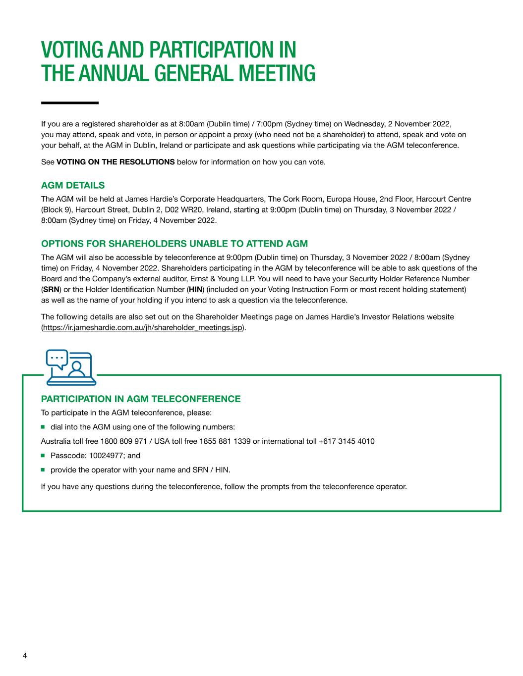 4 VOTING AND PARTICIPATION IN THE ANNUAL GENERAL MEETING If you are a registered shareholder as at 8:00am (Dublin time) / 7:00pm (Sydney time) on Wednesday, 2 November 2022, you may attend, speak and vote, in person or appoint a proxy (who need not be a shareholder) to attend, speak and vote on your behalf, at the AGM in Dublin, Ireland or participate and ask questions while participating via the AGM teleconference. See VOTING ON THE RESOLUTIONS below for information on how you can vote. AGM DETAILS The AGM will be held at James Hardie’s Corporate Headquarters, The Cork Room, Europa House, 2nd Floor, Harcourt Centre (Block 9), Harcourt Street, Dublin 2, D02 WR20, Ireland, starting at 9:00pm (Dublin time) on Thursday, 3 November 2022 / 8:00am (Sydney time) on Friday, 4 November 2022. OPTIONS FOR SHAREHOLDERS UNABLE TO ATTEND AGM The AGM will also be accessible by teleconference at 9:00pm (Dublin time) on Thursday, 3 November 2022 / 8:00am (Sydney time) on Friday, 4 November 2022. Shareholders participating in the AGM by teleconference will be able to ask questions of the Board and the Company’s external auditor, Ernst & Young LLP. You will need to have your Security Holder Reference Number (SRN) or the Holder Identification Number (HIN) (included on your Voting Instruction Form or most recent holding statement) as well as the name of your holding if you intend to ask a question via the teleconference. The following details are also set out on the Shareholder Meetings page on James Hardie’s Investor Relations website (https://ir.jameshardie.com.au/jh/shareholder_meetings.jsp). PARTICIPATION IN AGM TELECONFERENCE To participate in the AGM teleconference, please: dial into the AGM using one of the following numbers: Australia toll free 1800 809 971 / USA toll free 1855 881 1339 or international toll +617 3145 4010 Passcode: 10024977; and provide the operator with your name and SRN / HIN. If you have any questions during the teleconference, follow the prompts from the teleconference operator.