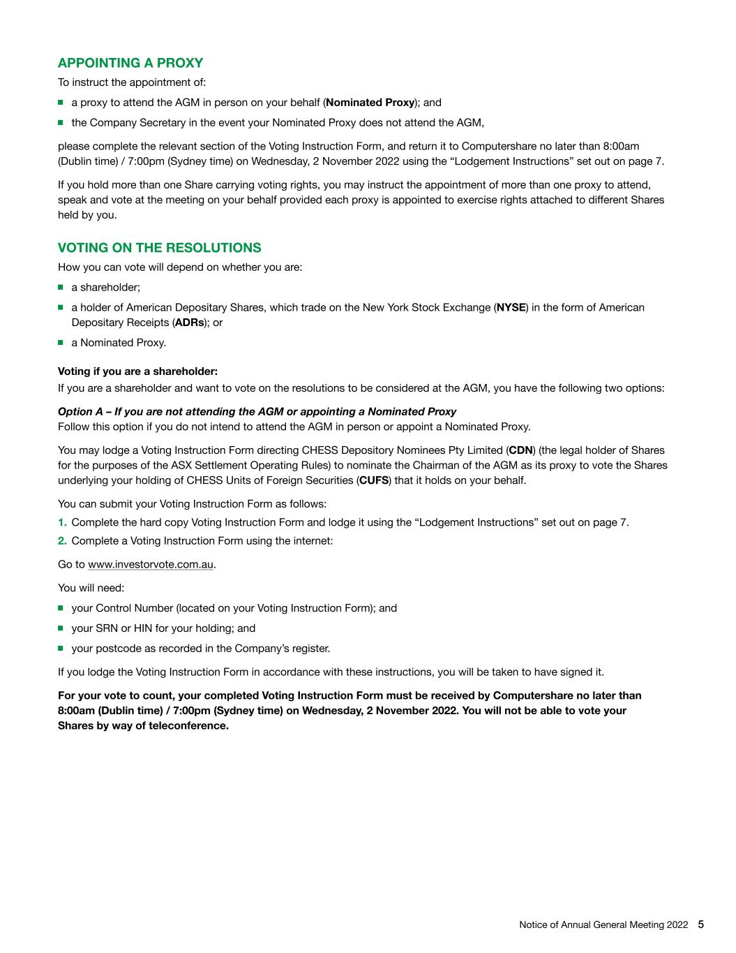 Notice of Annual General Meeting 2022 5 APPOINTING A PROXY To instruct the appointment of: a proxy to attend the AGM in person on your behalf (Nominated Proxy); and the Company Secretary in the event your Nominated Proxy does not attend the AGM, please complete the relevant section of the Voting Instruction Form, and return it to Computershare no later than 8:00am (Dublin time) / 7:00pm (Sydney time) on Wednesday, 2 November 2022 using the “Lodgement Instructions” set out on page 7. If you hold more than one Share carrying voting rights, you may instruct the appointment of more than one proxy to attend, speak and vote at the meeting on your behalf provided each proxy is appointed to exercise rights attached to different Shares held by you. VOTING ON THE RESOLUTIONS How you can vote will depend on whether you are: a shareholder; a holder of American Depositary Shares, which trade on the New York Stock Exchange (NYSE) in the form of American Depositary Receipts (ADRs); or a Nominated Proxy. Voting if you are a shareholder: If you are a shareholder and want to vote on the resolutions to be considered at the AGM, you have the following two options: Option A – If you are not attending the AGM or appointing a Nominated Proxy Follow this option if you do not intend to attend the AGM in person or appoint a Nominated Proxy. You may lodge a Voting Instruction Form directing CHESS Depository Nominees Pty Limited (CDN) (the legal holder of Shares for the purposes of the ASX Settlement Operating Rules) to nominate the Chairman of the AGM as its proxy to vote the Shares underlying your holding of CHESS Units of Foreign Securities (CUFS) that it holds on your behalf. You can submit your Voting Instruction Form as follows: 1. Complete the hard copy Voting Instruction Form and lodge it using the “Lodgement Instructions” set out on page 7. 2. Complete a Voting Instruction Form using the internet: Go to www.investorvote.com.au. You will need: your Control Number (located on your Voting Instruction Form); and your SRN or HIN for your holding; and your postcode as recorded in the Company’s register. If you lodge the Voting Instruction Form in accordance with these instructions, you will be taken to have signed it. For your vote to count, your completed Voting Instruction Form must be received by Computershare no later than 8:00am (Dublin time) / 7:00pm (Sydney time) on Wednesday, 2 November 2022. You will not be able to vote your Shares by way of teleconference.