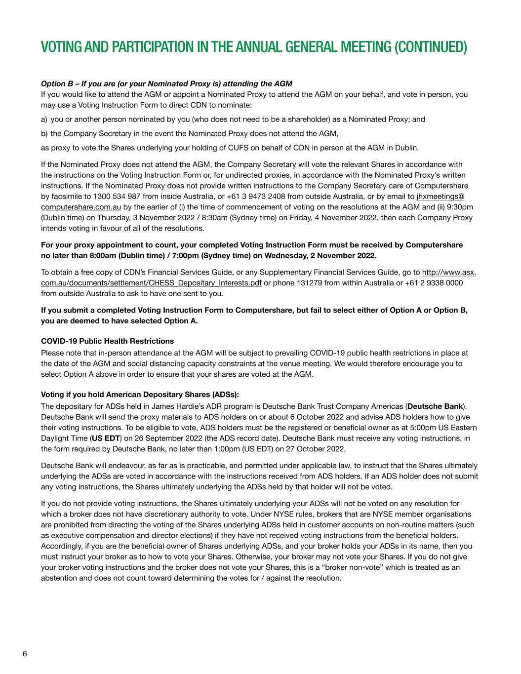 6 Option B – If you are (or your Nominated Proxy is) attending the AGM If you would like to attend the AGM or appoint a Nominated Proxy to attend the AGM on your behalf, and vote in person, you may use a Voting Instruction Form to direct CDN to nominate: a) you or another person nominated by you (who does not need to be a shareholder) as a Nominated Proxy; and b) the Company Secretary in the event the Nominated Proxy does not attend the AGM, as proxy to vote the Shares underlying your holding of CUFS on behalf of CDN in person at the AGM in Dublin. If the Nominated Proxy does not attend the AGM, the Company Secretary will vote the relevant Shares in accordance with the instructions on the Voting Instruction Form or, for undirected proxies, in accordance with the Nominated Proxy’s written instructions. If the Nominated Proxy does not provide written instructions to the Company Secretary care of Computershare by facsimile to 1300 534 987 from inside Australia, or +61 3 9473 2408 from outside Australia, or by email to jhxmeetings@ computershare.com.au by the earlier of (i) the time of commencement of voting on the resolutions at the AGM and (ii) 9:30pm (Dublin time) on Thursday, 3 November 2022 / 8:30am (Sydney time) on Friday, 4 November 2022, then each Company Proxy intends voting in favour of all of the resolutions. For your proxy appointment to count, your completed Voting Instruction Form must be received by Computershare no later than 8:00am (Dublin time) / 7:00pm (Sydney time) on Wednesday, 2 November 2022. To obtain a free copy of CDN’s Financial Services Guide, or any Supplementary Financial Services Guide, go to http://www.asx. com.au/documents/settlement/CHESS_Depositary_Interests.pdf or phone 131279 from within Australia or +61 2 9338 0000 from outside Australia to ask to have one sent to you. If you submit a completed Voting Instruction Form to Computershare, but fail to select either of Option A or Option B, you are deemed to have selected Option A. COVID-19 Public Health Restrictions Please note that in-person attendance at the AGM will be subject to prevailing COVID-19 public health restrictions in place at the date of the AGM and social distancing capacity constraints at the venue meeting. We would therefore encourage you to select Option A above in order to ensure that your shares are voted at the AGM. Voting if you hold American Depositary Shares (ADSs): The depositary for ADSs held in James Hardie’s ADR program is Deutsche Bank Trust Company Americas (Deutsche Bank). Deutsche Bank will send the proxy materials to ADS holders on or about 6 October 2022 and advise ADS holders how to give their voting instructions. To be eligible to vote, ADS holders must be the registered or beneficial owner as at 5:00pm US Eastern Daylight Time (US EDT) on 26 September 2022 (the ADS record date). Deutsche Bank must receive any voting instructions, in the form required by Deutsche Bank, no later than 1:00pm (US EDT) on 27 October 2022. Deutsche Bank will endeavour, as far as is practicable, and permitted under applicable law, to instruct that the Shares ultimately underlying the ADSs are voted in accordance with the instructions received from ADS holders. If an ADS holder does not submit any voting instructions, the Shares ultimately underlying the ADSs held by that holder will not be voted. If you do not provide voting instructions, the Shares ultimately underlying your ADSs will not be voted on any resolution for which a broker does not have discretionary authority to vote. Under NYSE rules, brokers that are NYSE member organisations are prohibited from directing the voting of the Shares underlying ADSs held in customer accounts on non-routine matters (such as executive compensation and director elections) if they have not received voting instructions from the beneficial holders. Accordingly, if you are the beneficial owner of Shares underlying ADSs, and your broker holds your ADSs in its name, then you must instruct your broker as to how to vote your Shares. Otherwise, your broker may not vote your Shares. If you do not give your broker voting instructions and the broker does not vote your Shares, this is a “broker non-vote” which is treated as an abstention and does not count toward determining the votes for / against the resolution. VOTING AND PARTICIPATION IN THE ANNUAL GENERAL MEETING (CONTINUED)