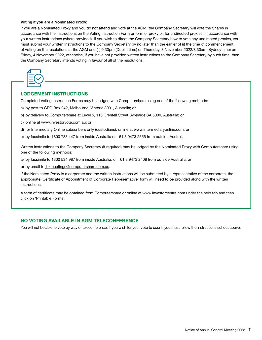 Notice of Annual General Meeting 2022 7 Voting if you are a Nominated Proxy: If you are a Nominated Proxy and you do not attend and vote at the AGM, the Company Secretary will vote the Shares in accordance with the instructions on the Voting Instruction Form or form of proxy or, for undirected proxies, in accordance with your written instructions (where provided). If you wish to direct the Company Secretary how to vote any undirected proxies, you must submit your written instructions to the Company Secretary by no later than the earlier of (i) the time of commencement of voting on the resolutions at the AGM and (ii) 9:30pm (Dublin time) on Thursday, 3 November 2022/8:30am (Sydney time) on Friday, 4 November 2022, otherwise, if you have not provided written instructions to the Company Secretary by such time, then the Company Secretary intends voting in favour of all of the resolutions. NO VOTING AVAILABLE IN AGM TELECONFERENCE You will not be able to vote by way of teleconference. If you wish for your vote to count, you must follow the instructions set out above. LODGEMENT INSTRUCTIONS Completed Voting Instruction Forms may be lodged with Computershare using one of the following methods: a) by post to GPO Box 242, Melbourne, Victoria 3001, Australia; or b) by delivery to Computershare at Level 5, 115 Grenfell Street, Adelaide SA 5000, Australia; or c) online at www.investorvote.com.au; or d) for Intermediary Online subscribers only (custodians), online at www.intermediaryonline.com; or e) by facsimile to 1800 783 447 from inside Australia or +61 3 9473 2555 from outside Australia. Written instructions to the Company Secretary (if required) may be lodged by the Nominated Proxy with Computershare using one of the following methods: a) by facsimile to 1300 534 987 from inside Australia, or +61 3 9473 2408 from outside Australia; or b) by email to [email protected]. If the Nominated Proxy is a corporate and the written instructions will be submitted by a representative of the corporate, the appropriate ‘Certificate of Appointment of Corporate Representative’ form will need to be provided along with the written instructions. A form of certificate may be obtained from Computershare or online at www.investorcentre.com under the help tab and then click on ‘Printable Forms’.